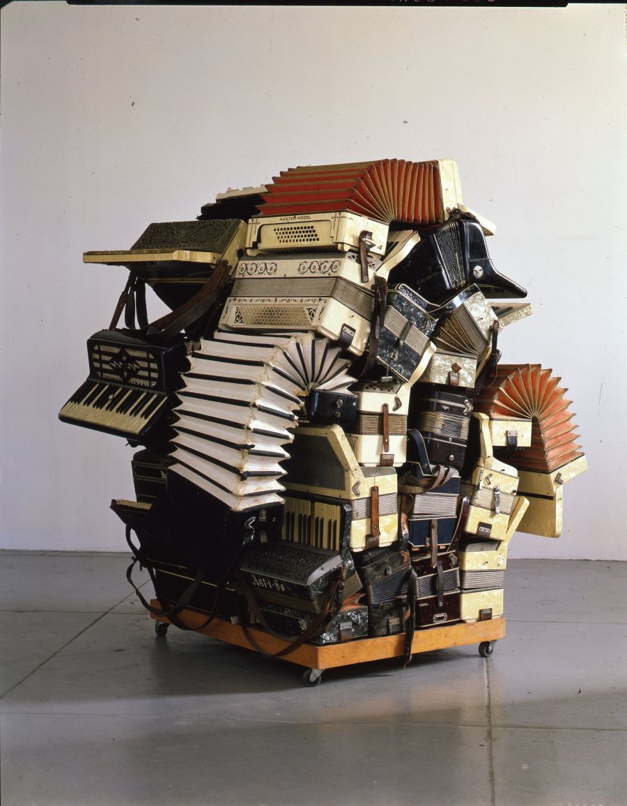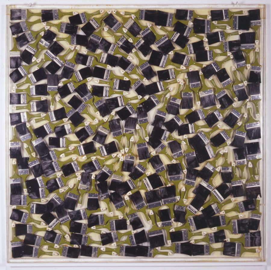 Accumulazione di pennelli, contrabasso affettato e vernice acrilica su tela (Accumulation of Paintbrushes, sliced fiddle bass and acrylic paint on canvas) 200,6 x 149,8 x 40,6 cm (79 x 59 x 16 in) ©Arman Studio New York