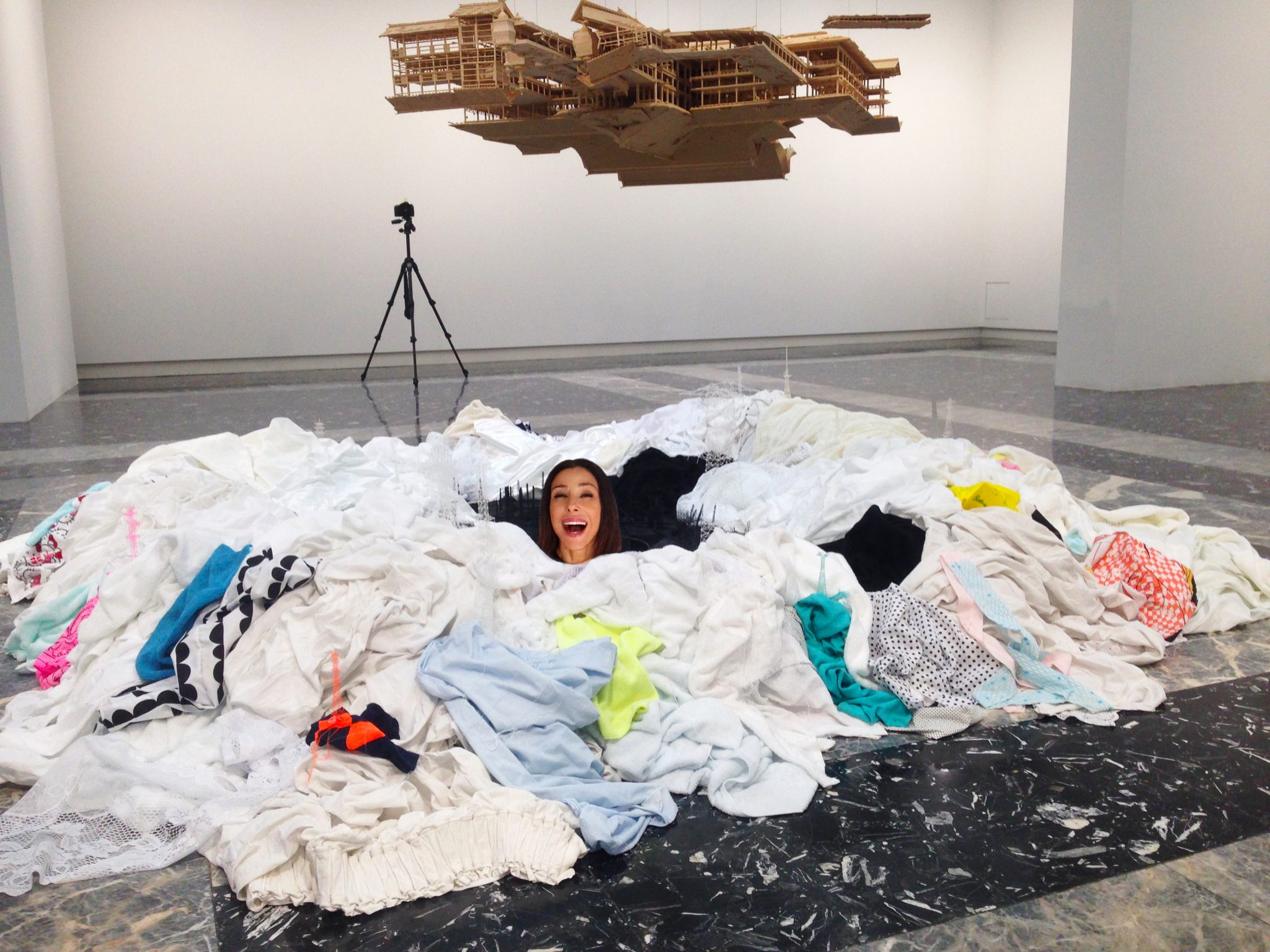 L’opera “Out of Disorder” (Mountains and Sea), 2017. Lenzuola, asciugamani e abiti raccolti tra il Giappone e Venezia raccolti in cumuli sul pavimento; osservando da vicino – o infilando la testa nella fessura a cui si accede dall’esterno dell’edificio – si vede chiaramente che i fili dipanati dai tessuti formano tralicci dell’elettricità, montagne russe, rotaie ecc.