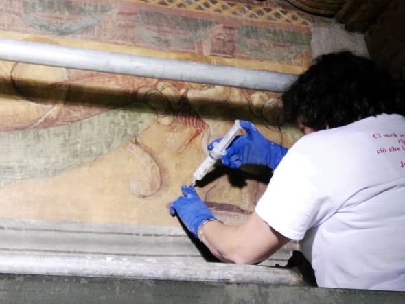 Il risultato è uno stupefacente equilibrio cromatico d’insieme e la possibilità di godere nuovamente l’illusione di un finto loggiato aperto, oltre che un ulteriore materiale di studio per appassionati e addetti ai lavori. Paolo Castellani, funzionario storico dell’arte del MiBACT, ha diretto il cantiere e pone l’accento sul tema della reintegrazione: la sua finalità deve essere una restituzione dell’unità e della continuità di lettura del testo figurativo, sempre nei limiti dell’applicazione rigorosa dei principi e dei metodi del restauro moderno. Le mancanze irrecuperabili sono state lasciate a vista con un trattamento a neutro del fondo, mentre si sono risarciti e integrati gli elementi decorativi ripetibili e le partiture architettoniche parzialmente conservate.