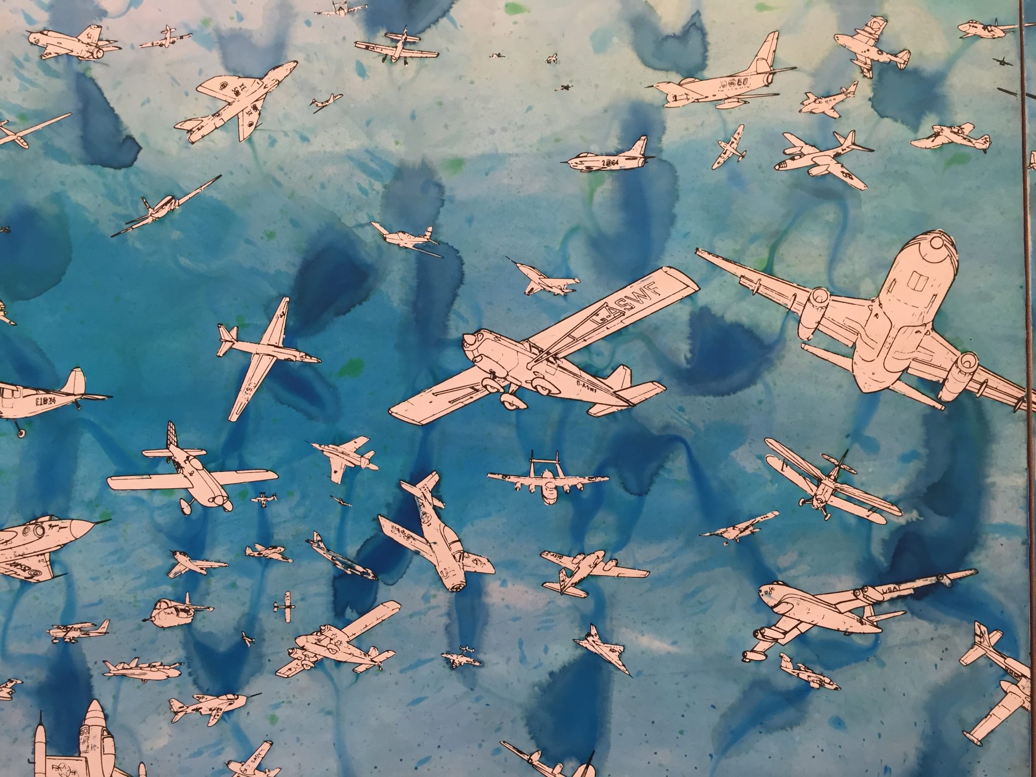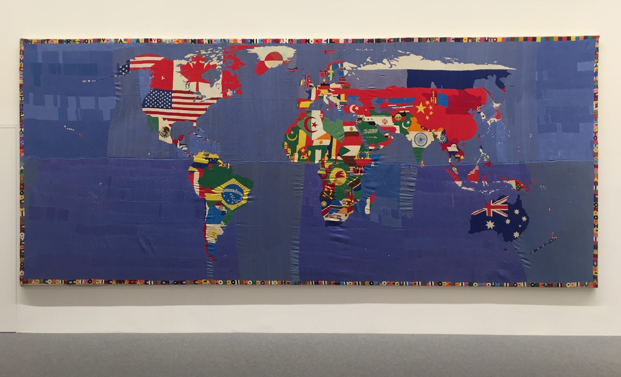 Si divertiva Alighiero Boetti. Creava giocando, giocando ad arte. Acquerellando e impiastricciando a inchiostro la tela di cielo dove far planare aeroplanini di carta. Tessendo figurine stilizzate a comporre il Tutto, incastrandosi nel tessuto, ritagliandosi nel colore. Puzzle. Patchwork. In scala, in formato minimo, massimo. Minimum/Maximum come recita il titolo della mostra alla Fondazione Giorgio Cini di Venezia (fino al prossimo 12 luglio), o più semplicemente “grande, piccolo”. Il “tappeto” quadrato di quasi due metri (quadrati) su cui brillano Titoli d’argento (1978), si rimpicciolisce una decade più tardi in un concentrato di Ordine e disordine ricamato dall’artista nell’89. I multiformi jet sopracitati galleggianti su un trittico di scie liquide finiscono in una pozza di inchiostro. Biro blu tracciata in minuscole onde. Serrati segmenti. Traccianti. Micro e macrocosmi costellano la mostra dedicata ad Alighiero Boetti (Torino, 1940 – Roma, 1994).