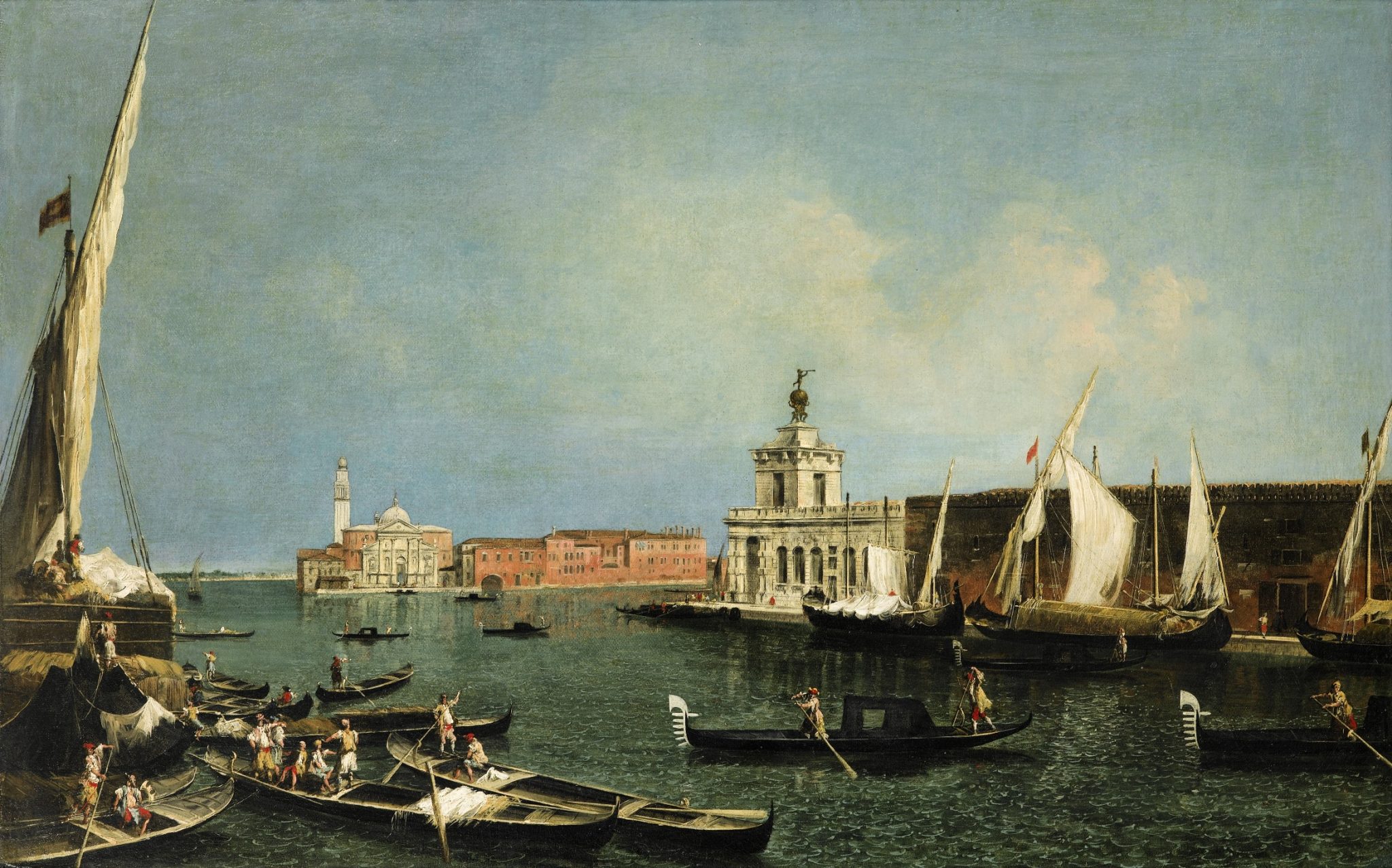 Dipinto tra il 1739 e 1740, La Punta della Dogana e san Giorgio Maggiore è una veduta realizzata più volte da Marieschi. Da un punto di vista iconografico l’opera è animata da una serie di figure colorate e gondole in primo piano. Di notevole pregio soprattutto per l’ampio panorama e la profondità della composizione: indubbiamente una delle opere più rilevanti dell’artista. Incoraggiato dal successo del grande artista veneziano Canaletto nel genere delle vedute, Marieschi ha adottato uno stile molto personale e immediatamente riconoscibile, caratterizzato da rapide pennellate, ricchezza di colori ed effetti di luce.