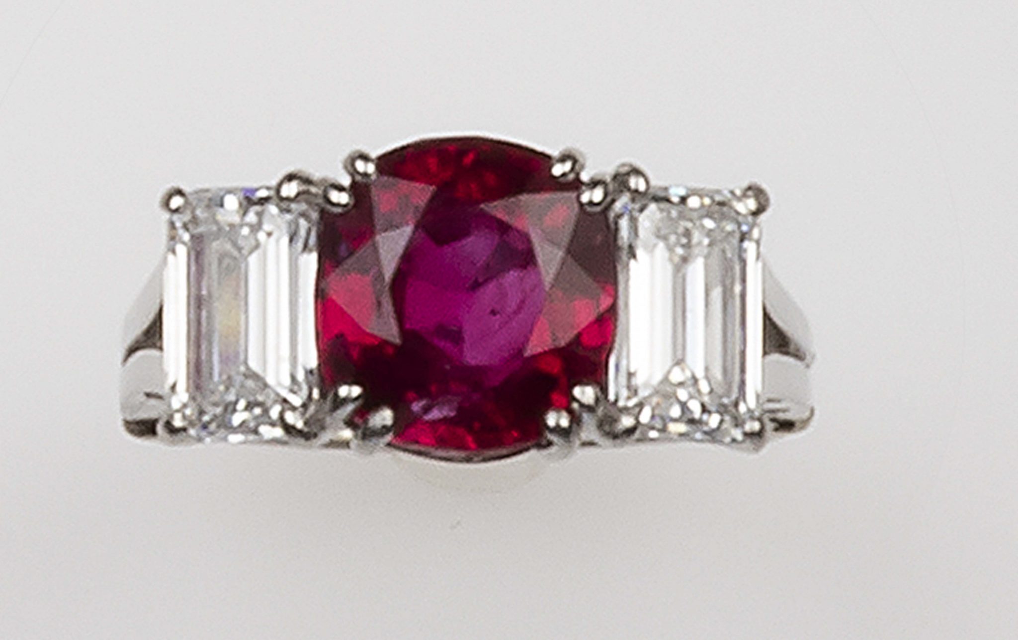 Anello con rubino Burma di ct 4,08 e due diamanti a contorno