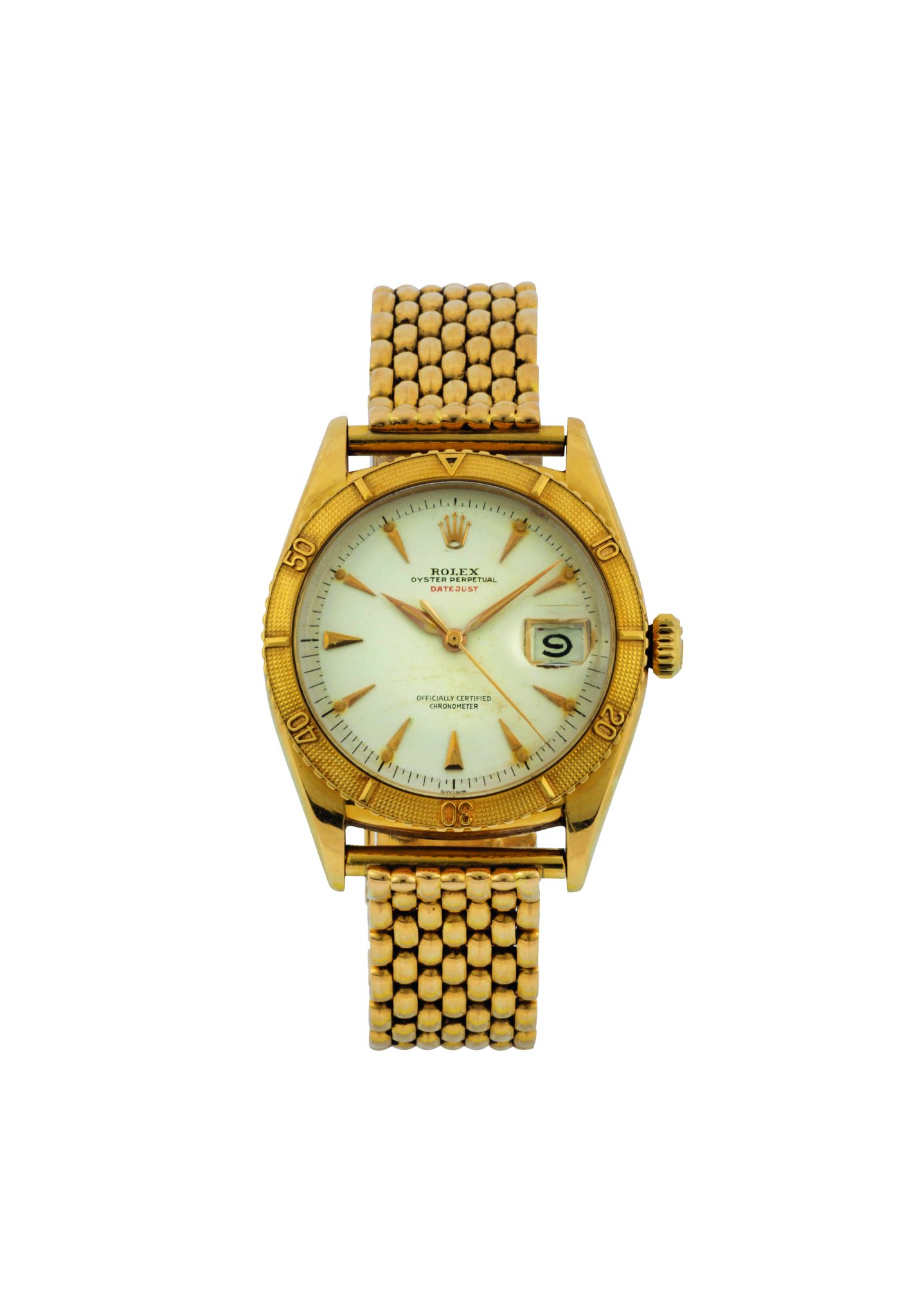 Raro orologio da polso, in oro giallo 18K, secondi al centro, automatico, impermeabile, con datario e bracciale in oro a “grana di riso” con chiusura deployante Rolex. Realizzato nel 1950 circa