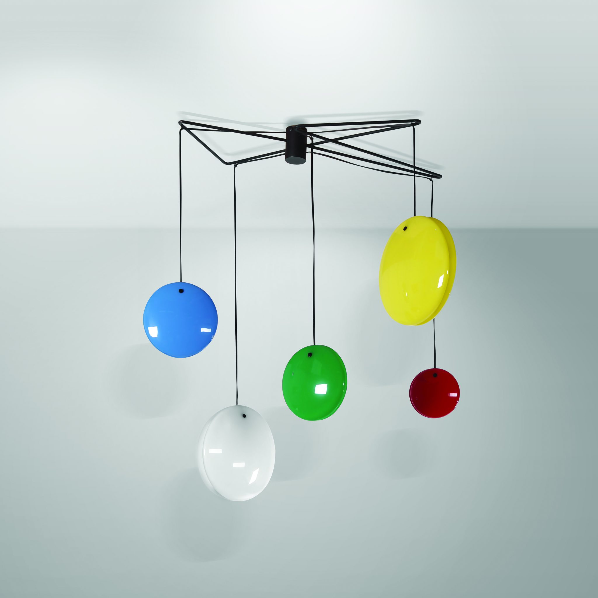 Lampadario 2072 “Jo-Jo” con struttura in metallo laccato e diffusori a doppia valva in metacrilato. Prod. Arteluce, Italia, 1953.