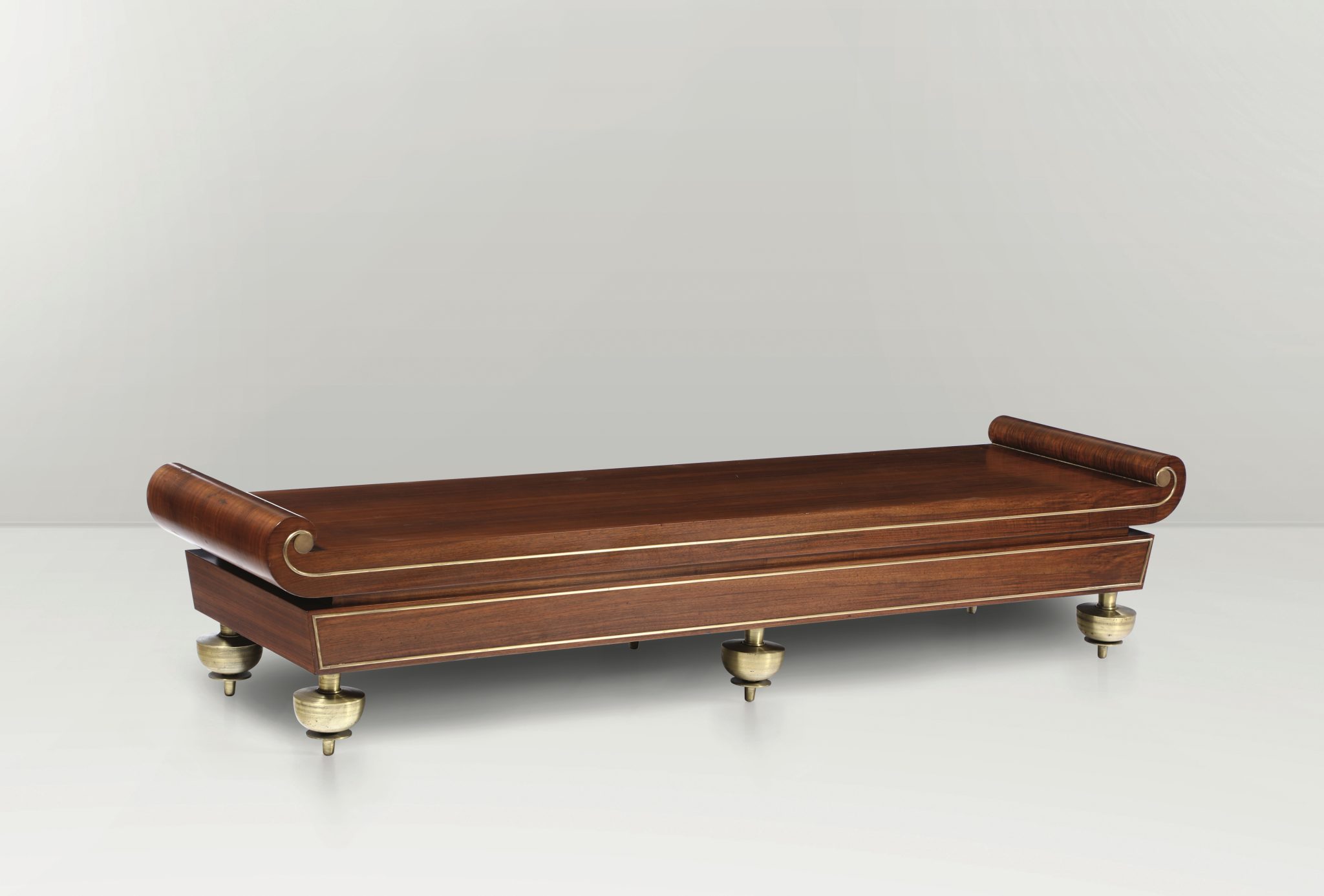 Panca da parete in legno di noce con supporti e dettagli in ottone. Realizzata in quattro esemplari per la quadreria del palazzo Contini Bonaccossi. Etichetta originale. Esecuzione dell’ebanista Magnoni e produzione Quarti, Italia, 1930