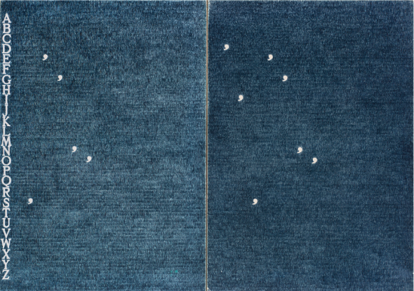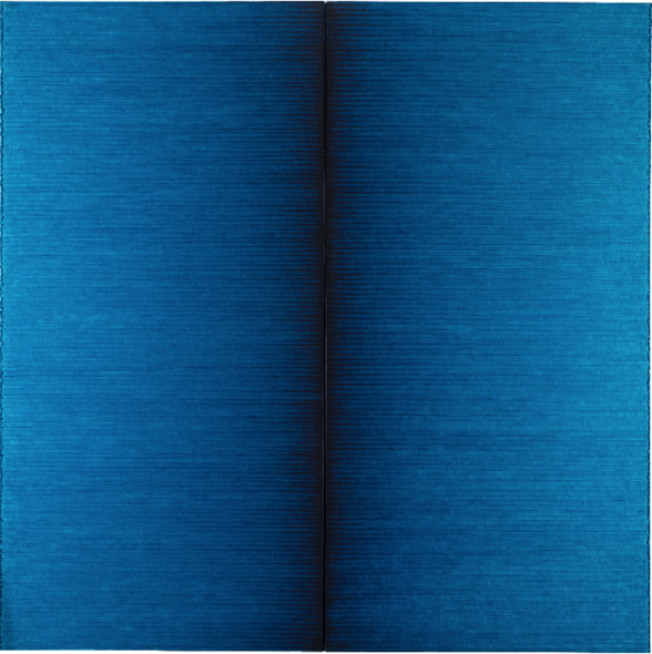 “Segno – disegno” 1983 ca. penna a sfera su cartoncino applicato su tela, cm 100×140 (dittico) Titolato al retro Provenienza Galleria La Bertesca, Genova Collezione privata, Milano Esposizioni “Internationale Kunstmesse”, Basilea, 12-17 giugno 1985 Opera accompagnata da certificato di autenticità su fotografia rilasciato dall’Archivio Alighiero Boetti, Roma, in data 28-2-2003, con il n. 2981