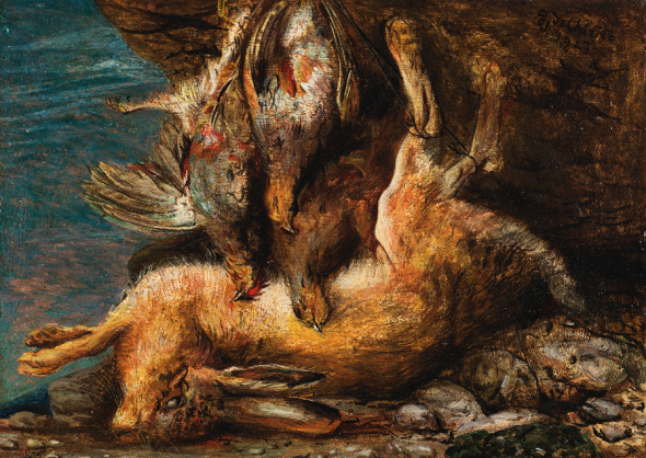 “Lepre e pernici” 1923 olio su cartone spesso, cm 43×58 Firmato e datato 1923 in alto a destra Valutazione 25.000,00 – 35.000,00€