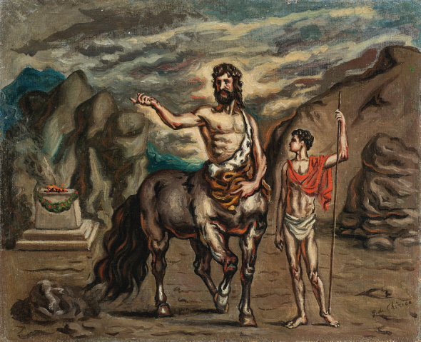 “Achille e Chirone” 1938 olio su tela, cm 48×60 Firmato in basso a destra. Firmato e titolato al retro