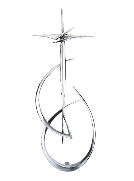 “Croce spaziale” 1969-71 scultura in bronzo cromato, cm 58,5×21 Firmata, datata 1971 e numerata es. 1/3 Firmata e datata 1969 in basso a destra sul plexiglass