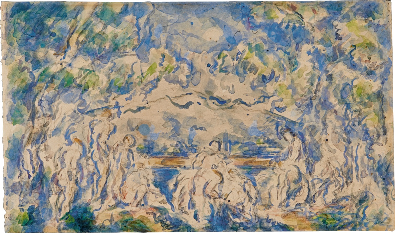Ritornando ad un soggetto che lo aveva affascinato sin dal 1860, Paul Cézanne dipinge le bagnanti dalla grande tradizione francese come un elemento compositivo per realizzare un’estetica completamente nuova e libera. Il sapiente uso dell’acquerello rende le figure quasi senza peso e completamente immerse nella natura. Le figure sono collocate in una composizione piramidale che rivela nel registro retrostante uno scorcio della celebre montagna Sainte-Victoire.