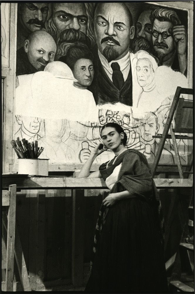 Con il tempo l’iniziale diffidenza si trasformerà in un’amicizia resa solida anche dalle numerose affinità e valori comuni come l’interesse per la politica. Nella mostra ci sono anche alcune testimonianze interessanti che riguardano un episodio significativo della vita della Kahlo e Rivera, legato a un loro soggiorno negli Stati Uniti. Siamo nella primavera del 1933 : il giovane Nelson Rockfeller commissiona (coraggiosamente) a Diego Rivera il murale per l’atrio di uno degli edifici del nuovo Rockfeller Center e poco dopo ne ordina la cancellazione . Rivera aveva inserito Lenin nella scena della parete intitolata “Man at the Crossroads”. Apriti cielo. Murale cancellato e commissioni future annullate. C’è una foto nella mostra dove Frida posa davanti l’opera prima che venisse cancellata: una testimonianza importante. A questo episodio poi si lega un’opera emblematica della pittrice – “My Dress Hangs There del 1933 – legata alla sua insofferenza per il suo soggiorno americano , agli stereotipi consumistici di quella società ma anche , in una lettura a più livelli – attraverso alcuni simboli alchemici nella composizione – un attacco ironico nei confronti del marito secondo lei troppo affascinato dalle luci scintillanti della ribalta. My dress hang there : Frida si sente la vera protagonista, con il suo stile inconfondibile , del viaggio in America.