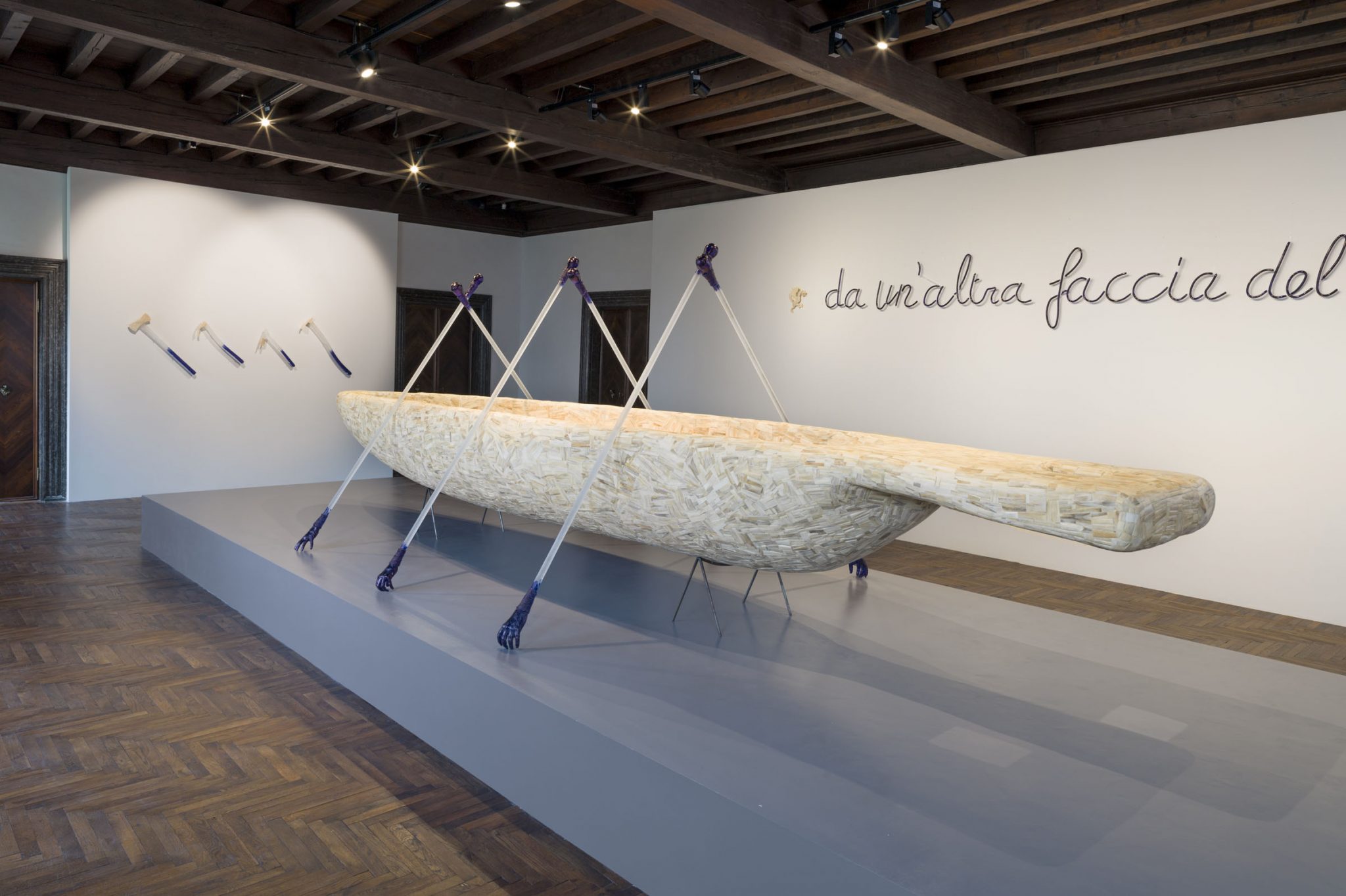 I due materiali modellano parti e insiemi di corpi umani e animali. Corpi che mantengono la loro naturalezza cromatica oppure vengono dipinti de blu tipico della penna a sfera Bic che l’artista usa da anni per raccontare l’Ora Blu, momento crepuscolare in cui avviene il passaggio dalla notte al giorno o viceversa: punto di confine e di mutamento del tempo naturale.