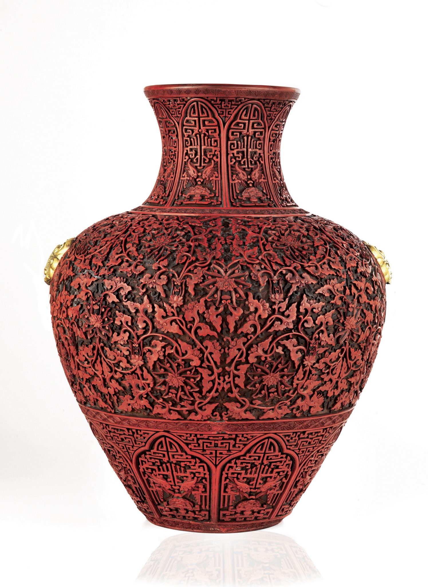 Un altro pezzo forte del catalogo è costituito da un vaso “HU” la cui superficie in lacca rossa è decorata con un intaglio di ramage fioriti che si susseguono senza soluzione di continuità scoprendo uno strato sottostante di lacca verde che a sua volta lascia intravvedere una tonalità di base giallo ocra. La stima di questo capolavoro realizzato a metà del XVIII secolo è di 15.000/20.000 euro.
