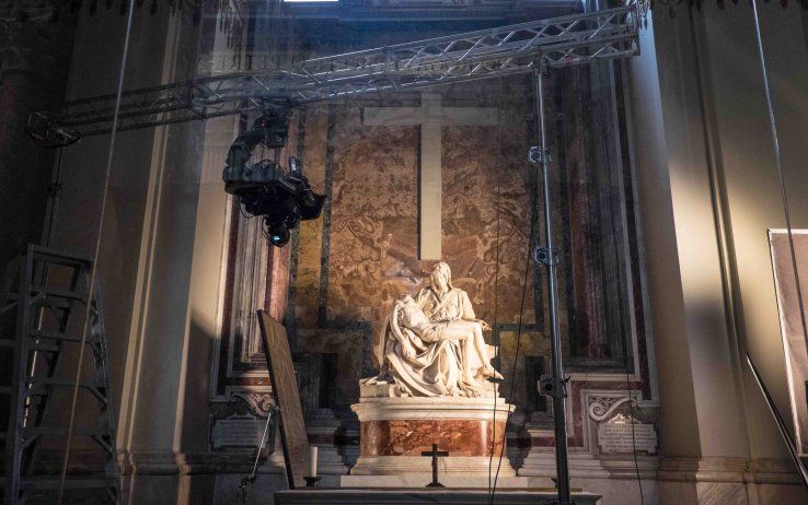 >> La Pietà di Michelangelo è ripresa per la prima volta oltre la teca di vetro, in modo da renderla visibile senza riflessi e mostrandone punti di vista fin’ora rimasti nascosti al pubblico.