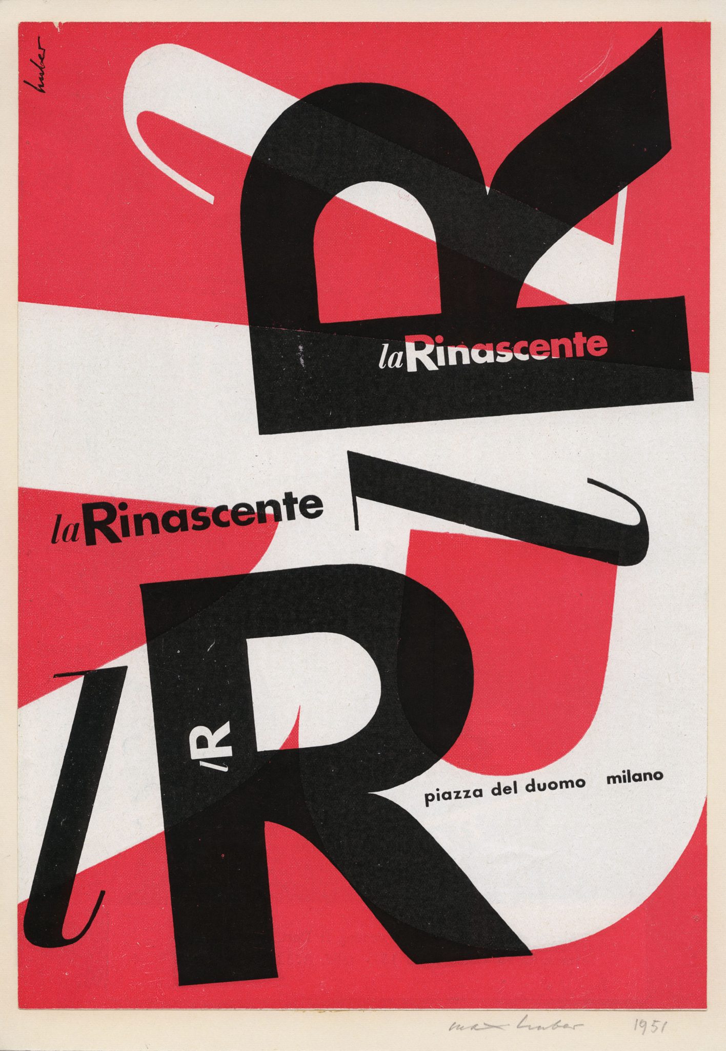 Dopo la distruzione della sede di Piazza Duomo a Milano il 4 dicembre 1950 riapre il grande magazzino con gli interni e gli arredi progettati dall’architetto Carlo Pagani, con un intero piano è dedicato all’arredamento. Ecco che si avvia una nuova fase per la Rinascente: la spinta alla ricostruzione e al successivo boom economico vengono sfruttati con sapienza imprenditoriale. In questo periodo si lancia anche il nuovo marchio con il monogramma “lR” creato dal giovane grafico svizzero Max Huber, che introduce un cambio di passo nell’immagine. Nasce uno “stile milanese” caratterizzato da geometria, fotografia, caratteri tipografici lineari, timbri cromatici e sovrastampe: un mix d’inventiva capace di unire i migliori grafici italiani con altri provenienti da tutto il mondo in una visione di forte internazionalizzazione.