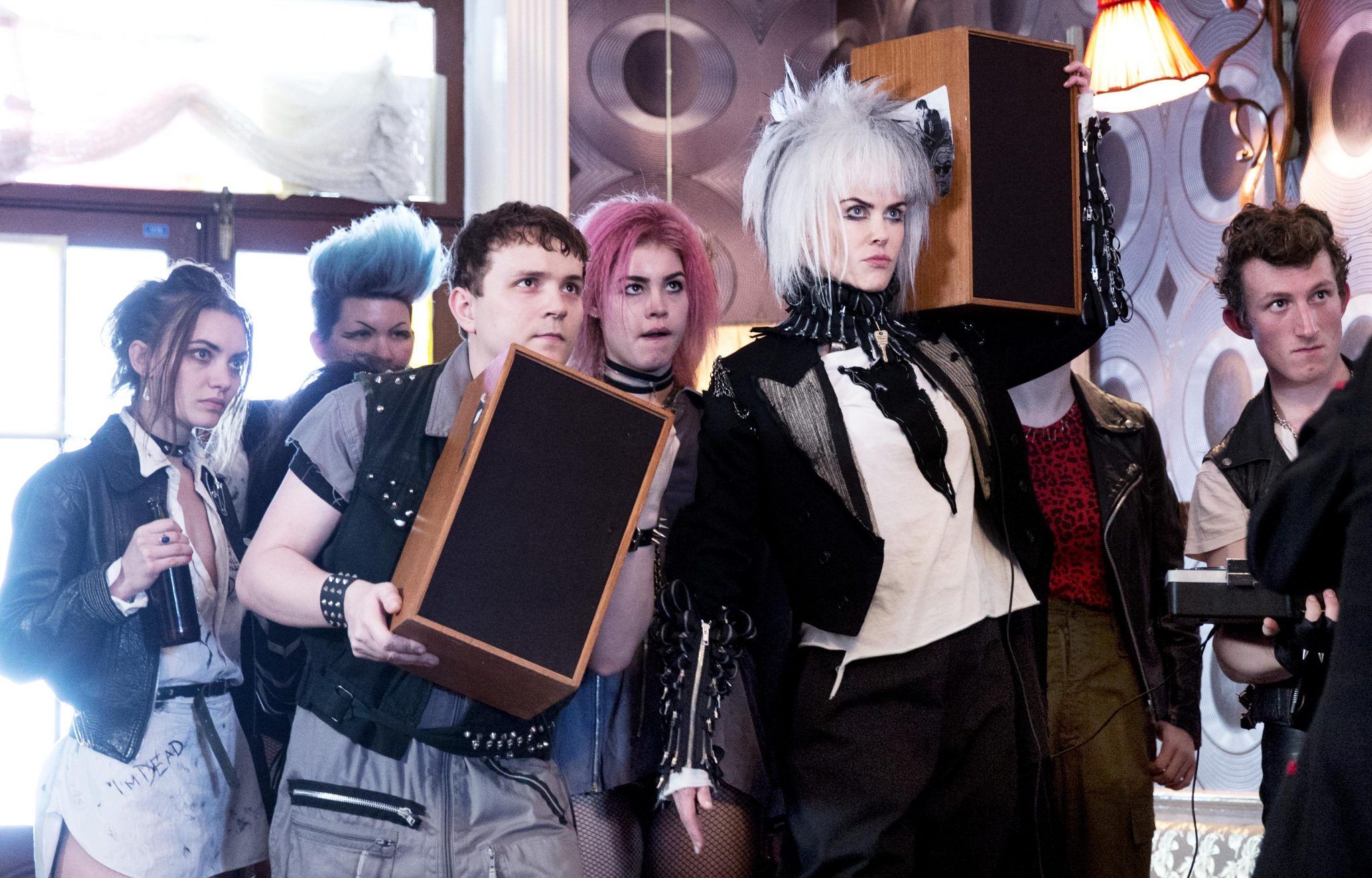 A fare da guardiana della rivoluzione giovanile è Nicole Kidman (di nuovo bellissima!) nei panni di Boadicea, sorella gemella del David Bowie di Labyrinth (Labyrinth – Dove tutto è possibile, Jim Henson, 1986), la talent scout (all’epoca in cui ancora esistevano i talent scout!) nonché dominatrix della wasted youth minorenne, artista eccentrica, stilista ricoperta di plastica e borchie, regina dei locali sotterranei nei quartieri di periferia.