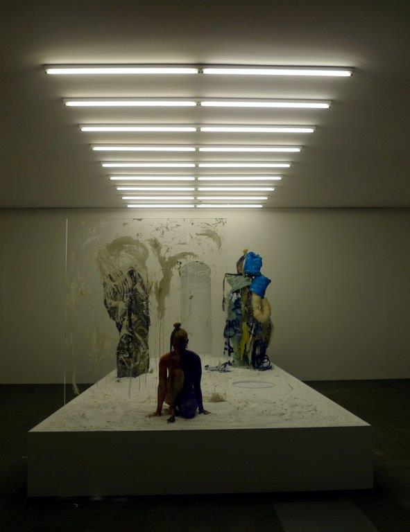 Segnalo un altro richiamo all’attualità. Il varietà musicale del missile. Mentre, ovviamente, la donna nuda non poteva mancare, ma è bella la performance di Donna Huanca. La modella si impasticcia con tinte, ovviamente pigmenti naturali, benché, come sanno gli artisti, i pigmenti naturali sono tossici come mai e nei secoli addietro ci si restava pure “secchi” a furia di succhiarsi le dita per pulirle.