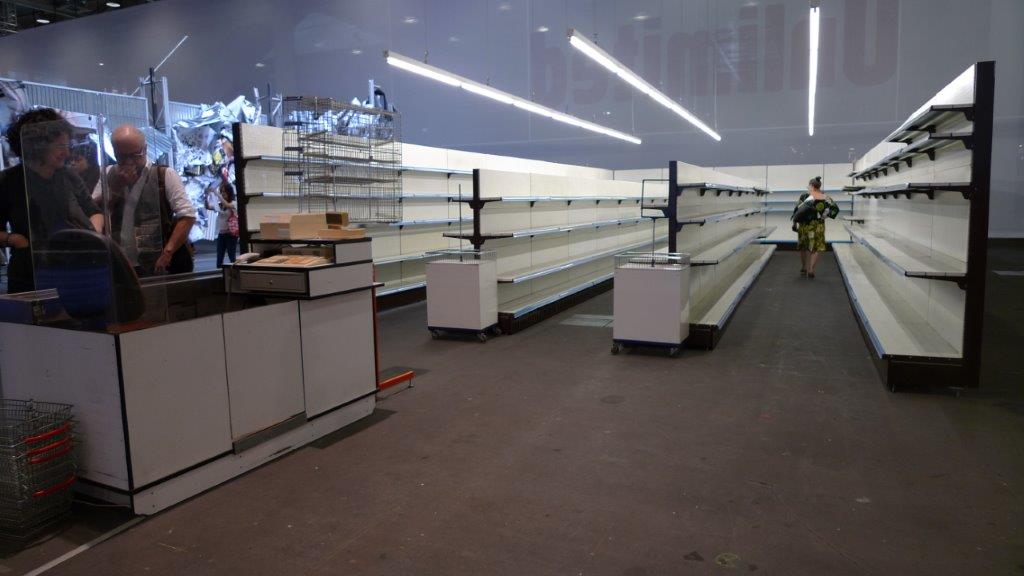 Ancora due menzioni: bello l’orecchio sofà, e il cagnolino addestratissimo a far da modello. E immancabile il supermarket vuoto, che è tema sempre presente, in varie declinazioni, nelle ampie mostre contemporanee. Posizionati nel futuro e guardando indietro.