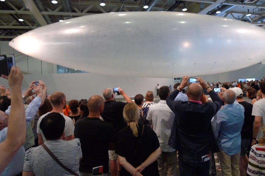 Qualcosa di grosso che si muove e magari gira in tondo ci vuole. Qualche edizione fa l’artista che ruotava al suo scrittoio su un enorme piatto. Stavolta una specie di dirigibile che vola in tondo e una folla di smartphone impazziti per fotografarlo si leva dalle braccia di altrettanti -ebbene sì- visitatori umani. Ci ha pensato Chris Burden a realizzarlo.