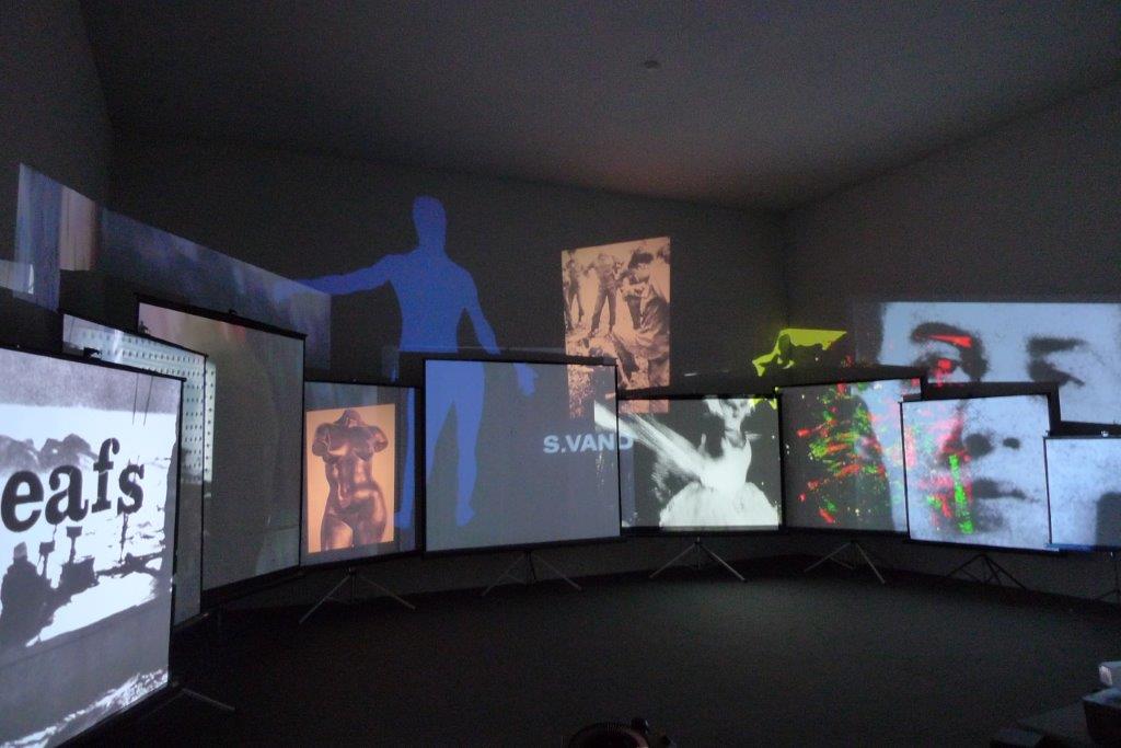 I video non sono moltissimi, ma la loro qualità, dal punto di vista scenico e delle immagini, continua a crescere, forse perdendo di fantasia, ma… Diversi dalle sperimentazioni di anni addietro, sono sempre più spettacolari e spesso distribuiti su tre grandi schermi o più. Uno dei primi che si mostra entrando è il Movie Mural di Van Der Beek. Le proiezioni multicolori non rispettano la forma degli schermi, creando un gioco di prospettive e di ombre.