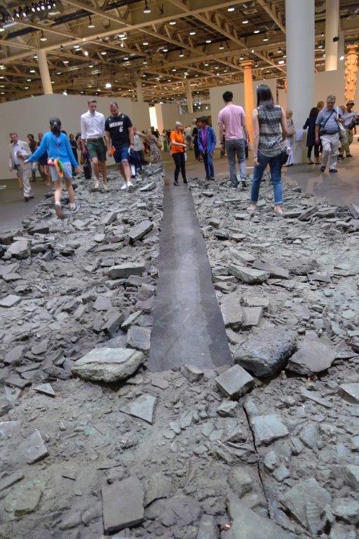 Altro concetto-istallazione che non può mancare è l’opera da calpestare. Ci ha pensato Massimo Bartolini con “Due”. Percorso su macerie da calpestare ma, attenzione, solo con le scarpe giuste. Per inciso, i ruderi, i rifiuti, il riciclo e le macerie, restano ora e chissà per quanto, materia preferita dagli artisti.