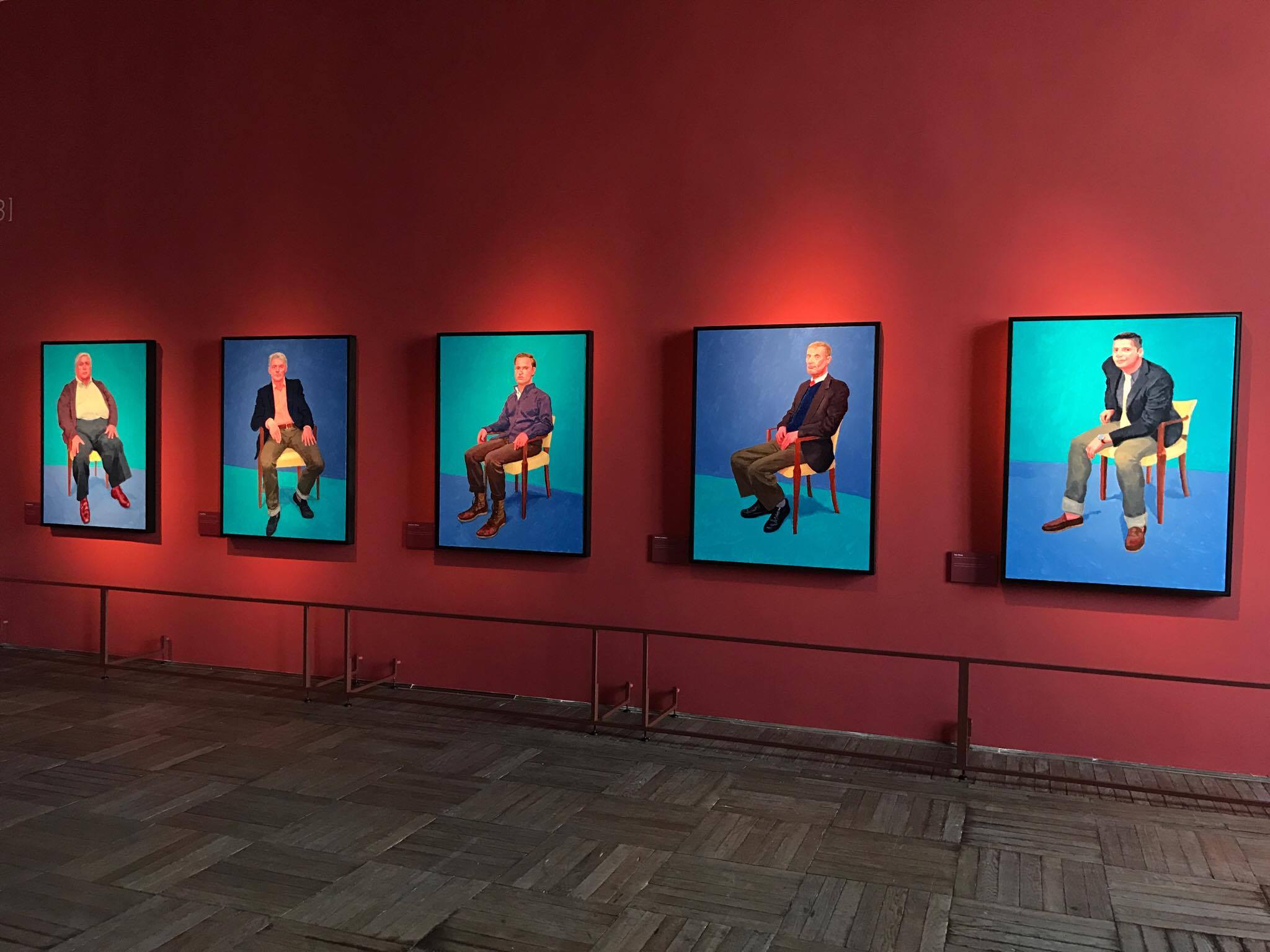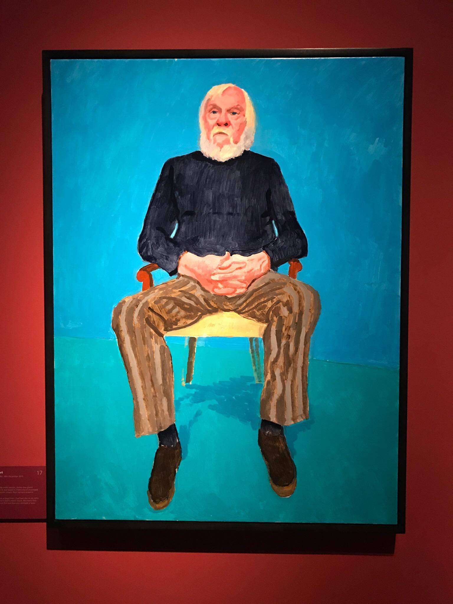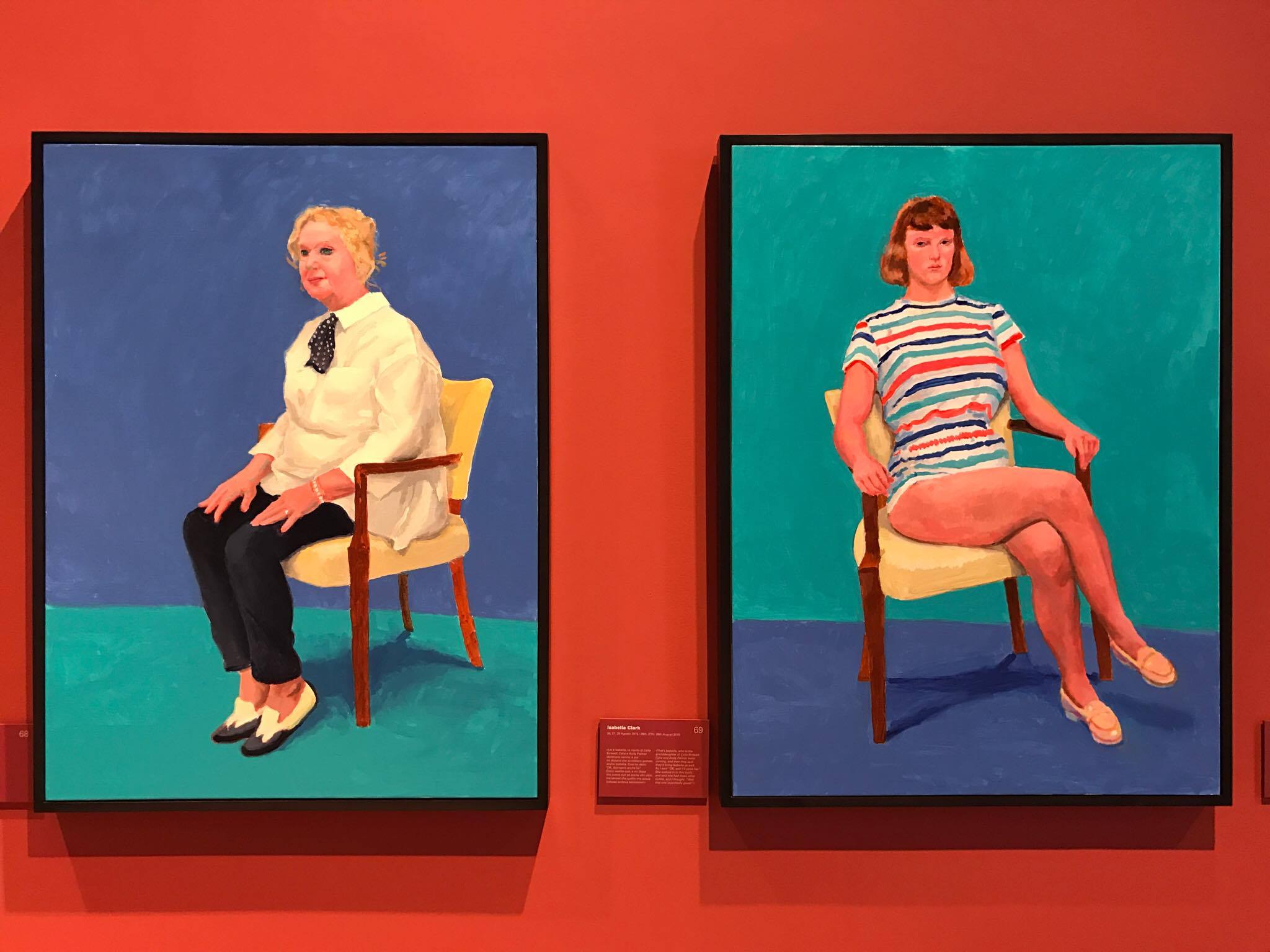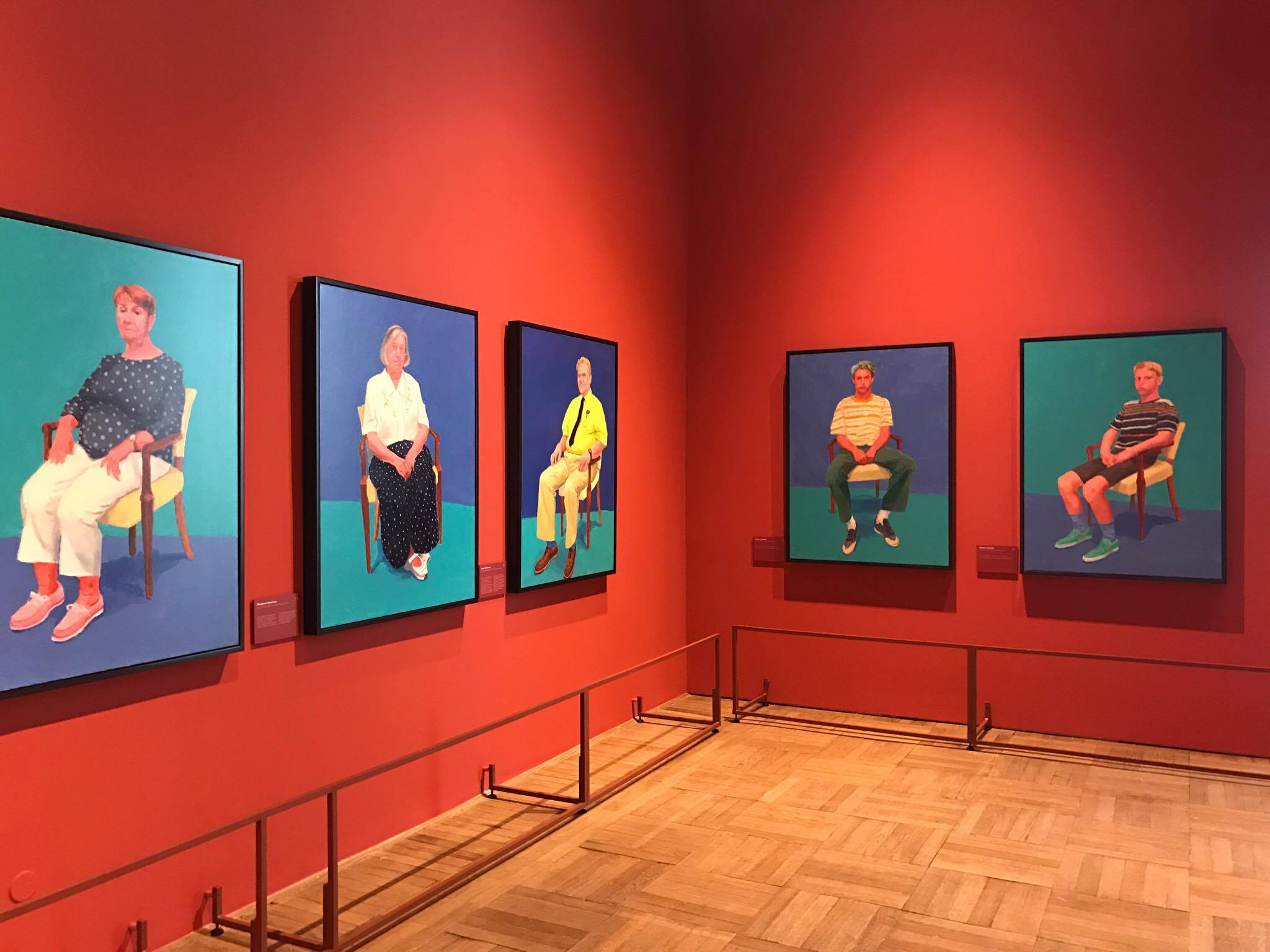 Amici di vecchia data, familiari, galleristi, critici, artisti, il suo dentista, la governante, i figli di amici. Nelle sale al secondo piano di Ca’ Pesaro sfila un’umanità variegata fatta di storie, volti, ricordi e aneddoti. Lo sfondo è sempre lo stesso e pure la sedia sulla quale i soggetti posano. Così l’attenzione si concentra sui dettagli: le pieghe di una gonna rossa di seta, gli occhiali nel taschino, la posa strafottente, lo sguardo triste, le mani congiunte sul grembo. Ogni ritratto è come un’istantanea su tela. Una polaroid a colori acrilici.