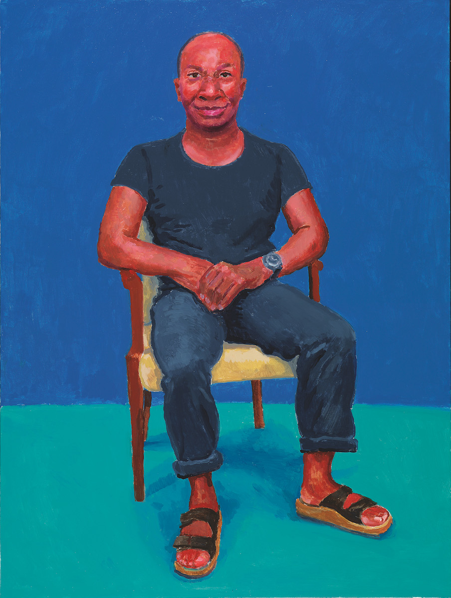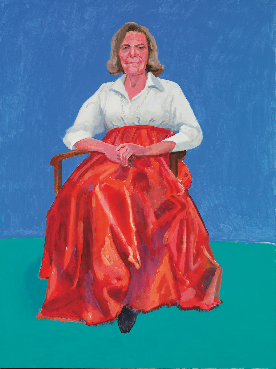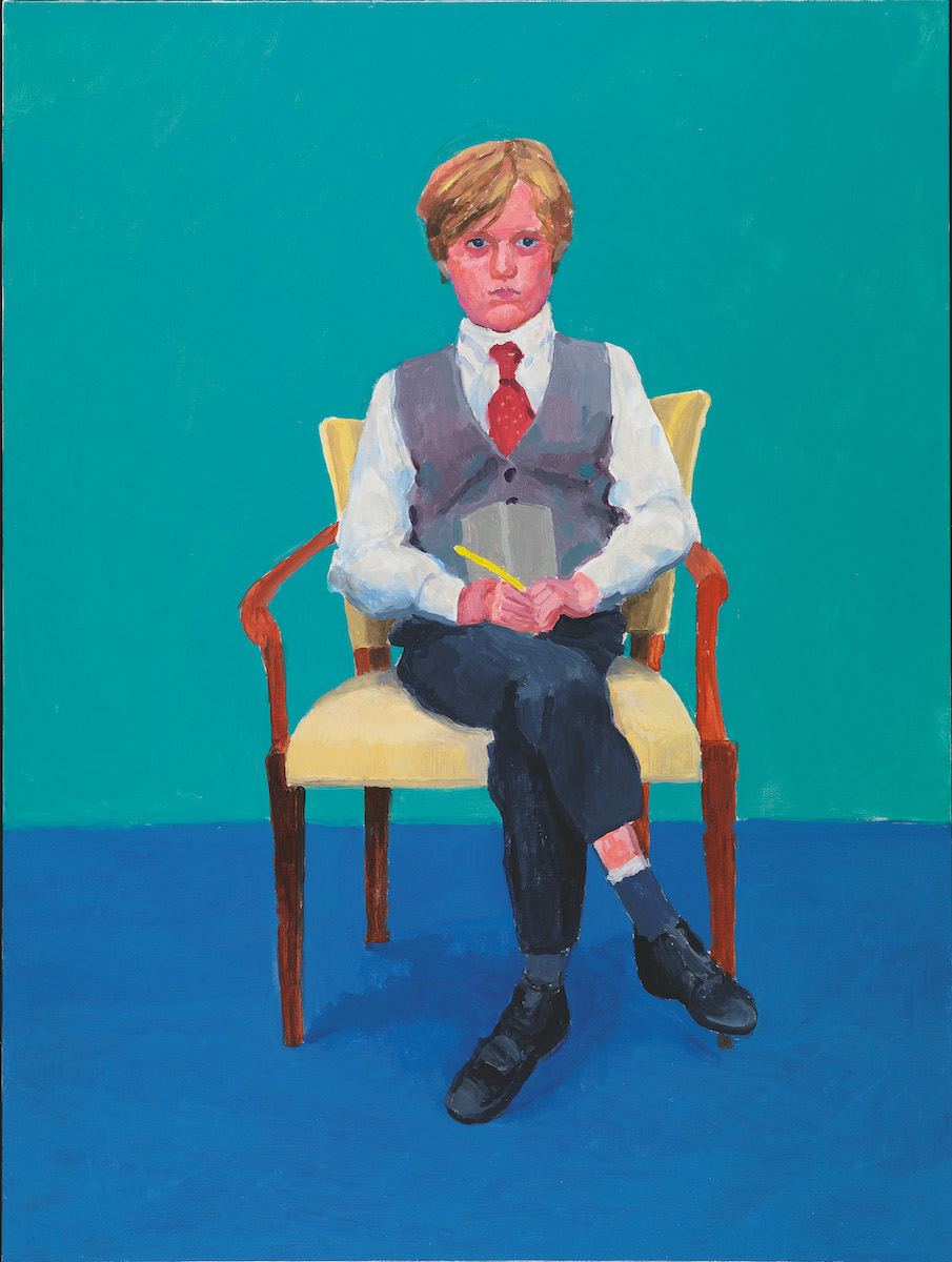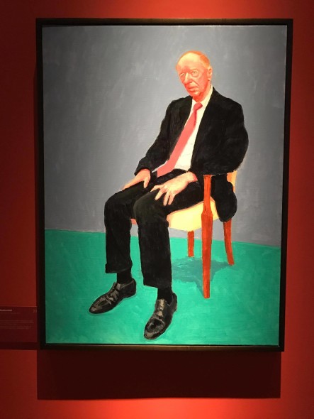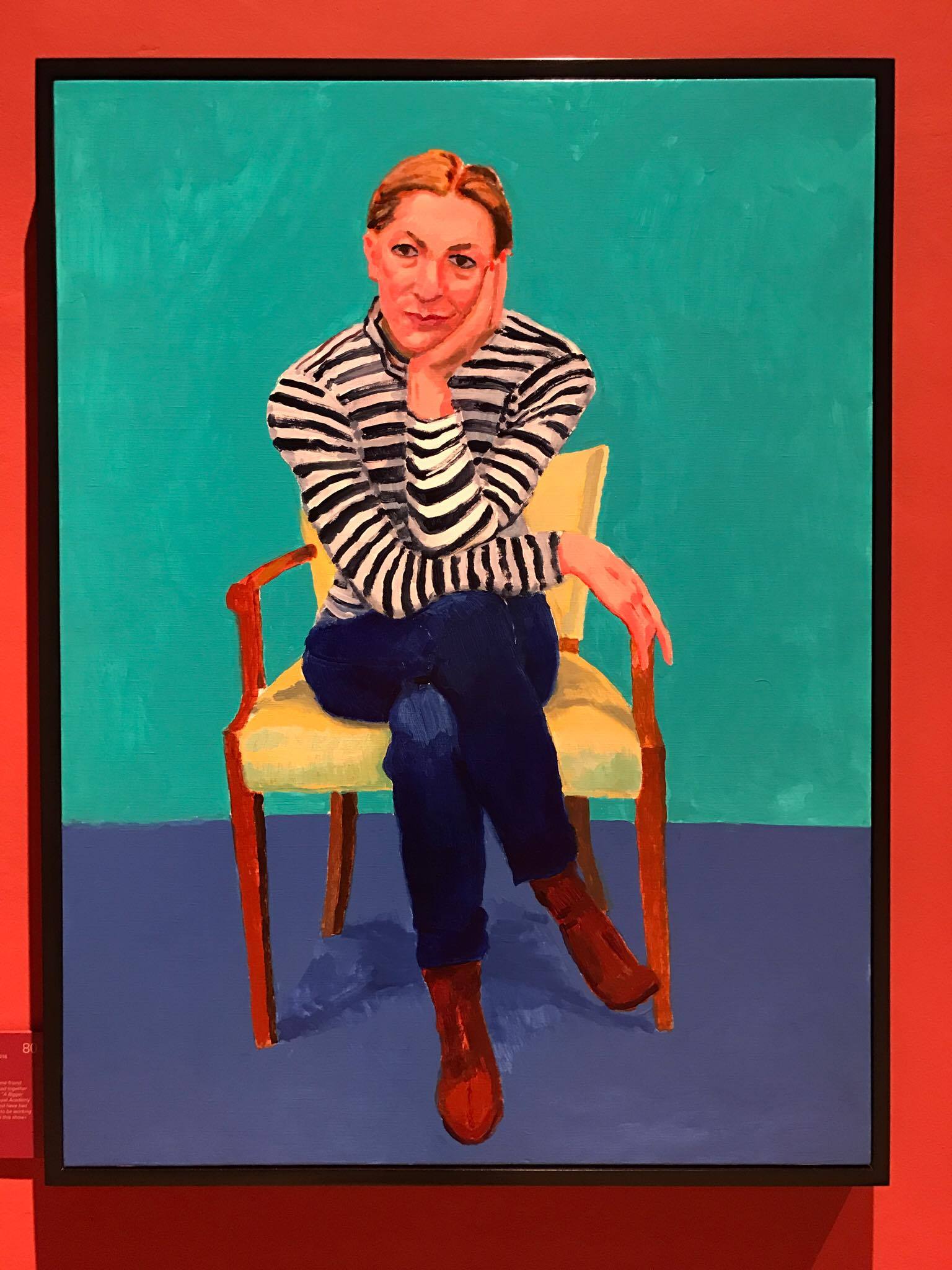 Amici di vecchia data, familiari, galleristi, critici, artisti, il suo dentista, la governante, i figli di amici. Nelle sale al secondo piano di Ca’ Pesaro sfila un’umanità variegata fatta di storie, volti, ricordi e aneddoti. Lo sfondo è sempre lo stesso e pure la sedia sulla quale i soggetti posano. Così l’attenzione si concentra sui dettagli: le pieghe di una gonna rossa di seta, gli occhiali nel taschino, la posa strafottente, lo sguardo triste, le mani congiunte sul grembo. Ogni ritratto è come un’istantanea su tela. Una polaroid a colori acrilici.