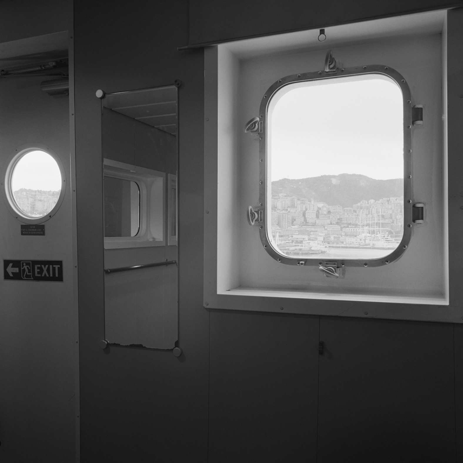 Un labirinto di stanze all’interno del quale orientarsi, dove spesso compare un oblò o una finestra, ma volutamente riprese attraverso un forte controluce: non c’è possibilità di geo localizzare la nave, s’intravvede qualcosa, ma l’atmosfera è ovattata. Camellini ha volutamente separato l’interno della piattaforma da tutto ciò che risiede al di fuori, due piani differenti, difficilmente conciliabili. Quello che interessa al fotografo è quello che succede dentro alla città, l’organizzazione di un nuovo spazio, l’adattamento a nuove regole, la ricostruzione di un proprio guscio in cui vivere. In nessuna immagine compare l’uomo, ma sono gli spazi e gli oggetti stessi a metterlo in primo piano, ad aspettarlo come una presenza momentaneamente sospesa.