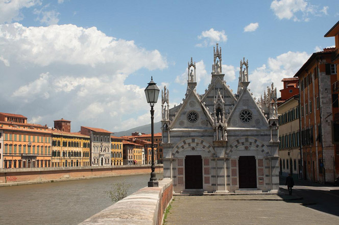 “… As light through fog …” Architectural memory pierced by art è stata ideata da Nonas (New York 1936) appositamente per questo luogo ed è la seconda di una serie di interventi site specific di grandi artisti nazionali e internazionali attraverso i quali il Comune di Pisa intende valorizzare ed esaltare le caratteristiche proprie della chiesa, prezioso gioiello della città.