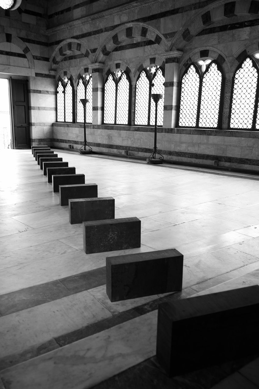 14 parallelepipedi uguali in ferro pieno, collocati a circa 80 cm uno dall’altro in modo da disegnare una linea diagonale di circa 14 metri che taglia lo spazio della navata della chiesa da sinistra a destra rispetto alla facciata. I singoli blocchi di metallo non hanno nessuna particolare bellezza in sé, nessun particolare pregio artistico o estetico. Essi sono semplicemente uno strumento che l’artista utilizza per tracciare una linea tridimensionale nello spazio architettonico.
