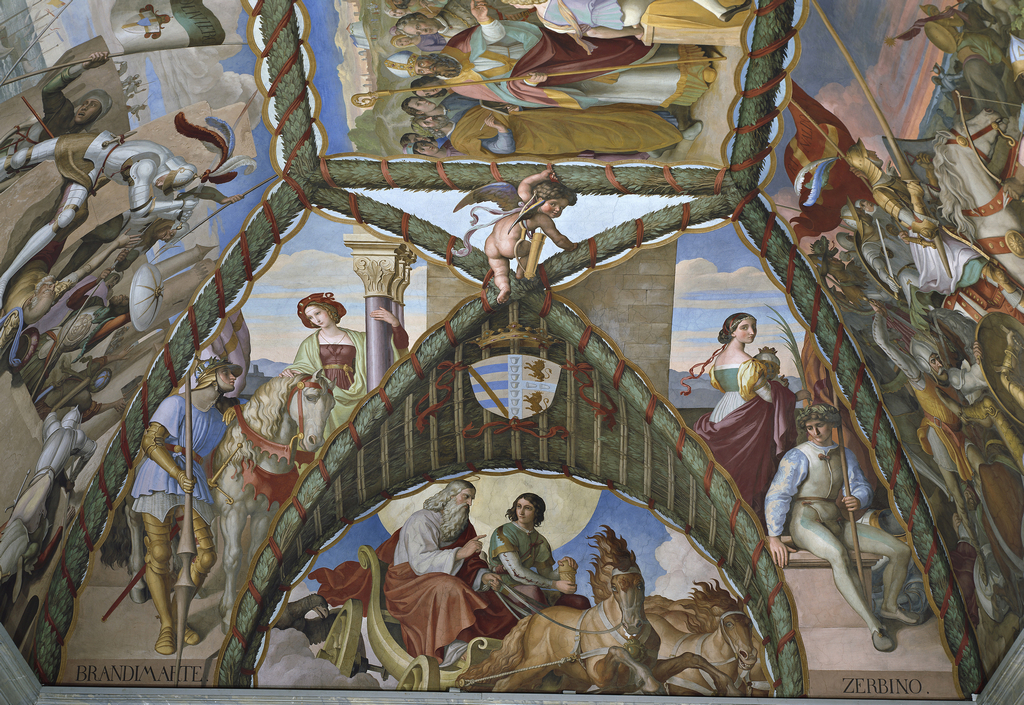 Alle sapienti mani dei Nazareni si deve quindi questa piccola ma immensa opera: una decorazione ad affresco che riveste interamente la pareti di ben tre sale del Casino. Ogni stanza descrive per immagini l’intero racconto dei tre più importanti poemi della letteratura italiana: la Divina Commedia di Dante, l’Orlando Furioso di Ariosto e la Gerusalemme Liberata di Tasso.