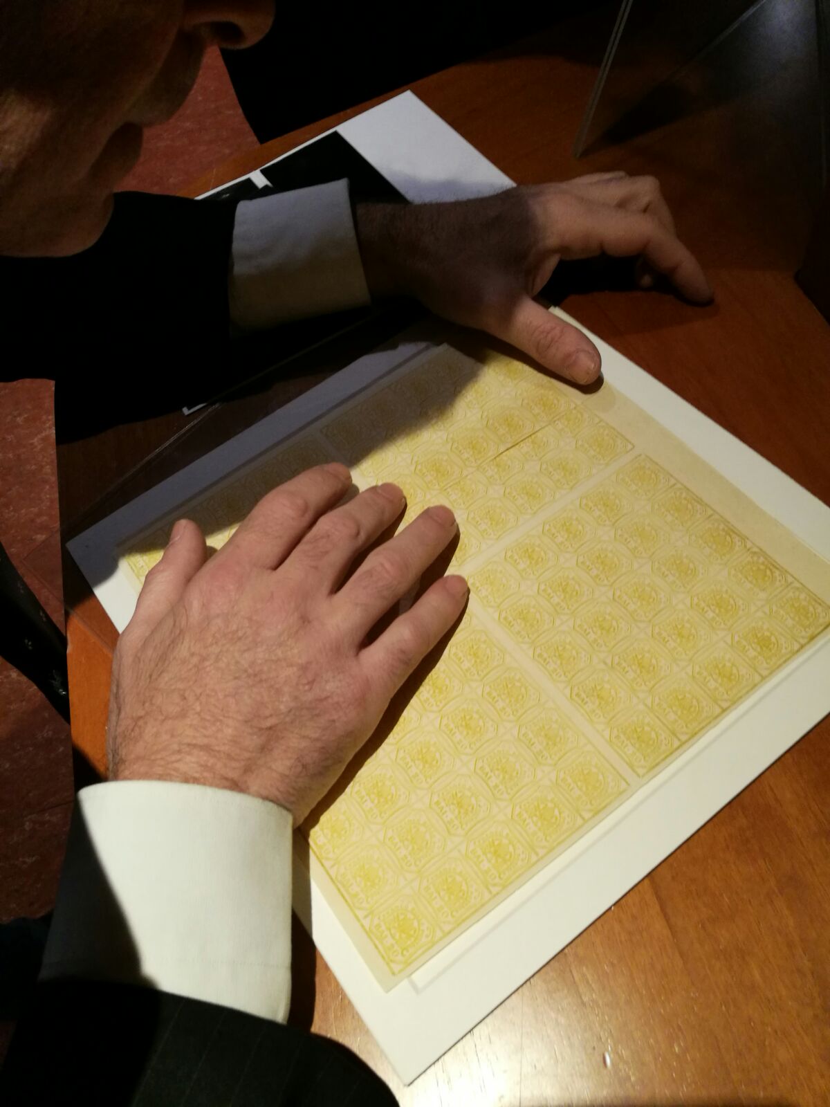 Di questa gemma filatelica (quotazione dell’esemplare singolo riferimento Catalogo Sassone 2017 425.000 €, importo facilmente moltiplicabile per i 5 esemplari ritrovati), si conosceva solo un foglio presso i Musei Vaticani, ed un singolo esemplare in mani private, apparso sul mercato nel lontano 1993 e ceduto all’epoca per ben 300 milioni di lire. Per verificare la completa e totale originalità gli esperti si sono recati presso i Musei Vaticani che hanno acconsentito a smontare il foglio di 100 esemplari dalla teca, così da poterlo approfonditamente confrontare con la striscia.