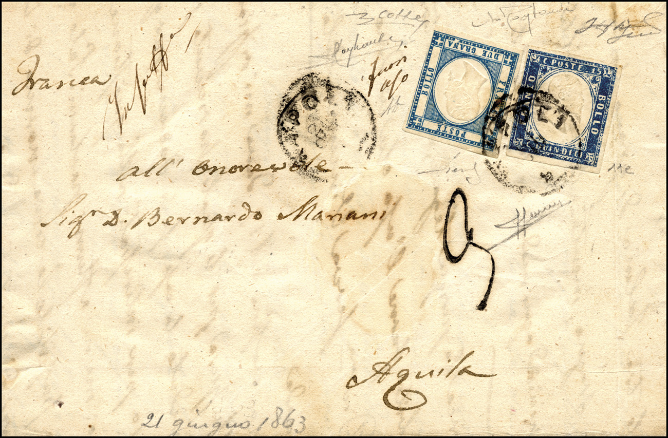 21/6/1863 a L’Aquila, tassata 30 cent. poiché fuori corso il 2 grana. Straordinaria affrancatura
