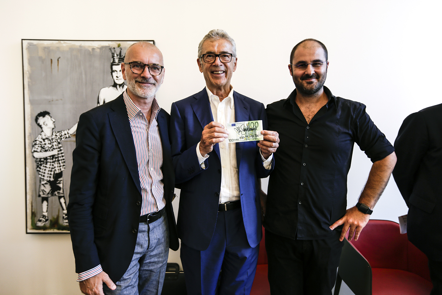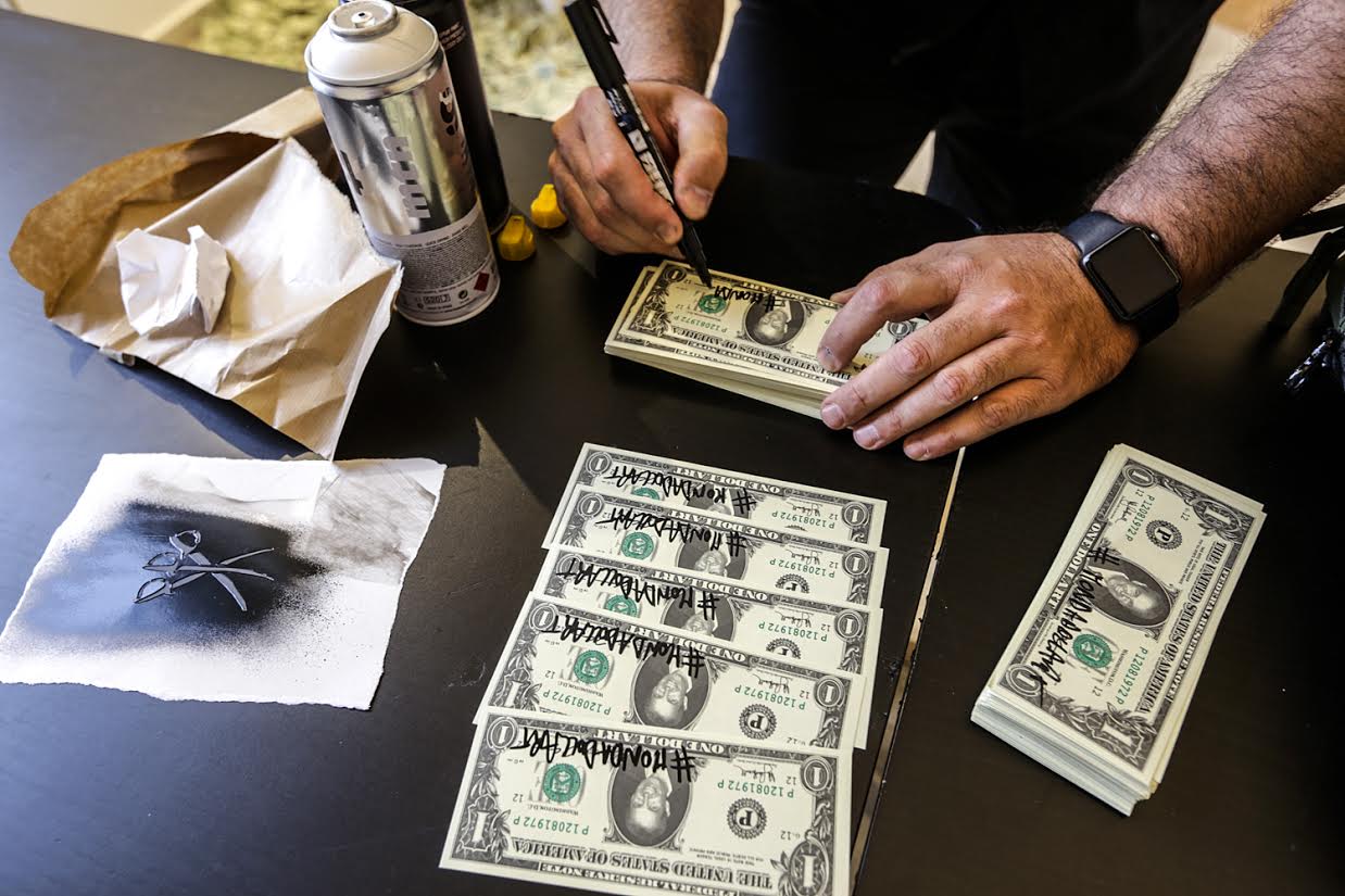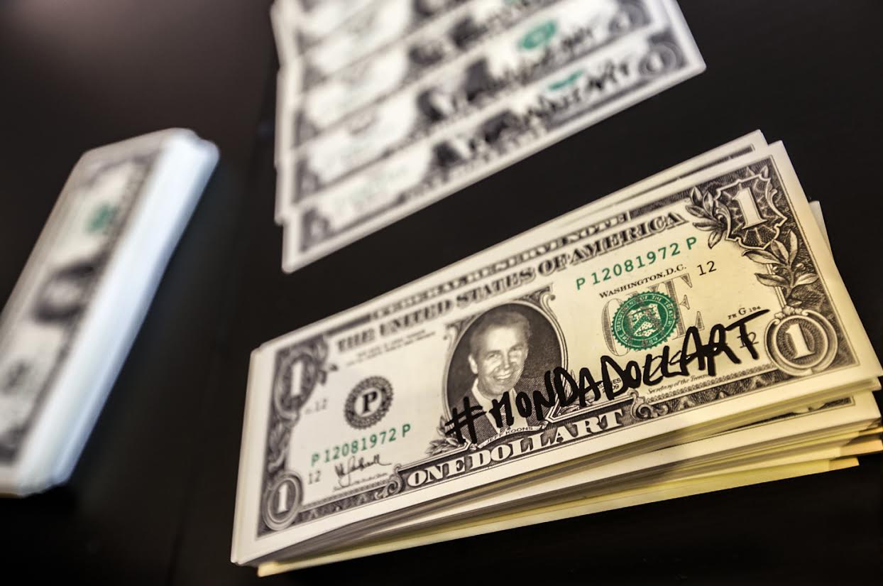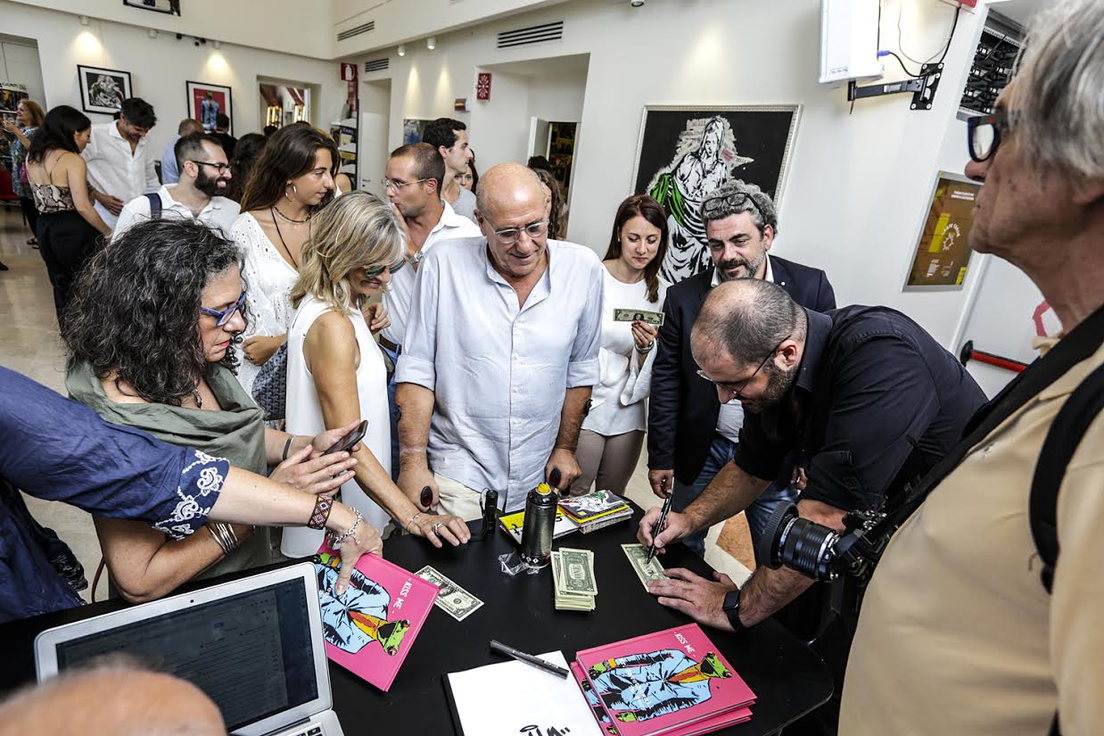 Da qui si capisce l’intento provocatorio e il ragionamento che Savethewall (alias Pierpaolo Perretta) sta conducendo contro la finanziarizzazione dell’arte contemporanea il cui valore spesso si limita solo al prezzo. La performance, durante l’inaugurazione del 10 luglio, è infatti consistita nel firmare dollart attribuendogli un valore d’artista doppio, e soprattutto nel firmare 100 euro di un visitatore aggiungendo la scritta “vale 200”, valore effettivamente confermato dalla volontà espressa pubblicamente di acquisto (per 200) da parte di un collezionista presente in sala e di un gallerista. Detto per inciso il visitatore si è tenuto i 100 euro firmati 200 motivando l’idea con il classico “non si sa mai, forse in futuro varranno di più” e manifestando anche nel piccolo l’idea di come l’arte induca alla speculazione.