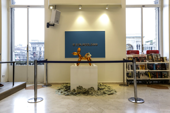L’installazione più divertente ma anche significativa della mostra è un piccolo balloon dog alla Jeff Koons che sta esplodendo e dalla cui pancia escono “dollart”, dollari fake con l’effige del celebre artista americano. Alle spalle dell’installazione, un monocromo azzurro su cui capeggia la cifra 119.922.500$ digitando la quale sui motori di ricerca in Internet compare l’Urlo di Munch, essendo questo il prezzo del quadro venduto all’asta nel 2012 e per un certo periodo il più alto mai battuto per un quadro.