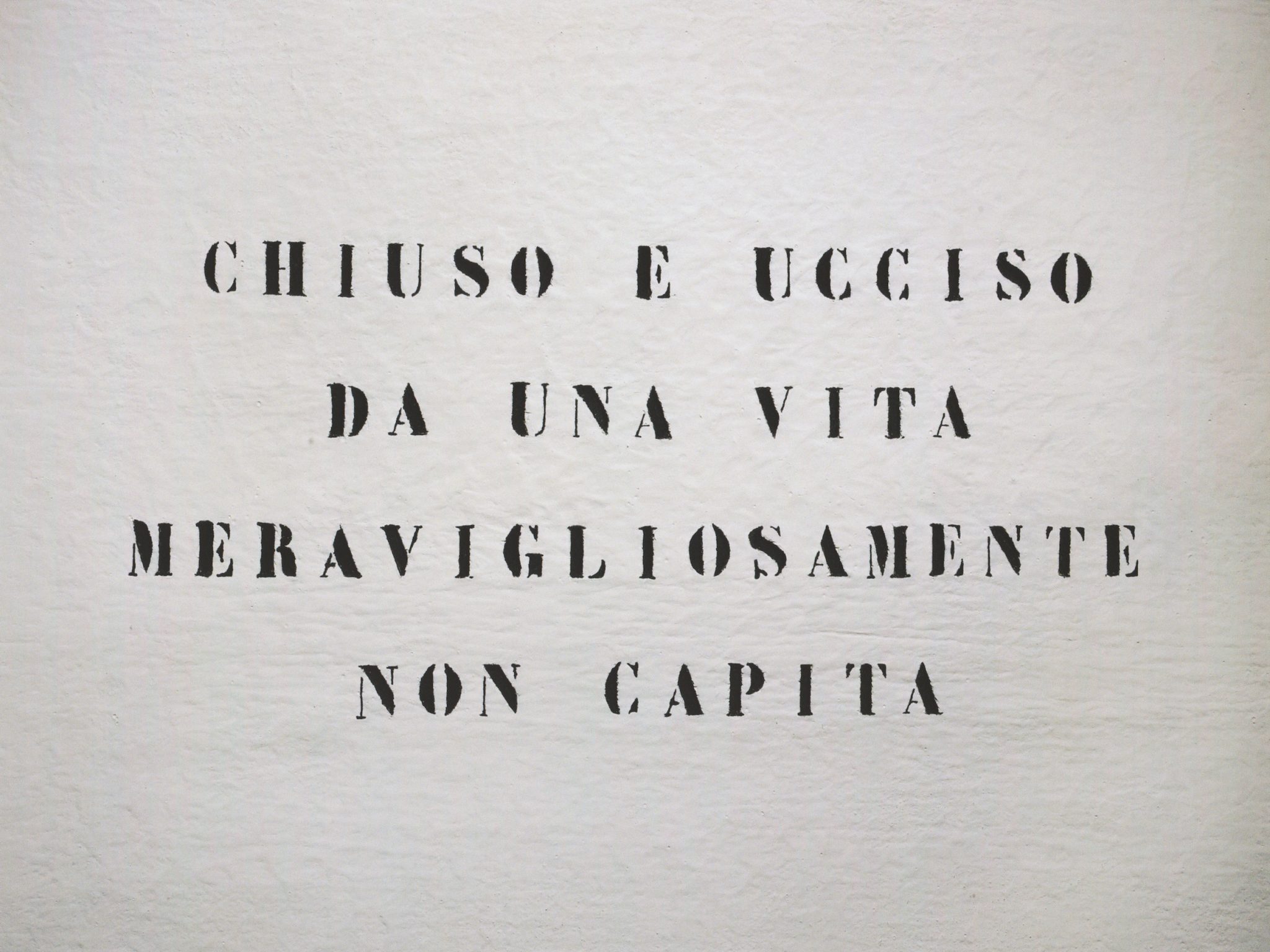 Una Olivetti argentea del 1968 in mezzo alla sala accompagnata da uno scritto appeso alla parete. Nome tecnico del “mezzo”: calcolatrice Divisumma 14. Nome d’arte: Macchina drogata. Il marchio di fabbrica apposto sullo scivolo di ghisa lascia il posto alla firma, “Vincenzo Agnetti ’68”. Protagonista del lavoro di Agnetti (Milano, 1926-1981) fin dalla prima mostra dedicatale a Milano nel ’69, la Macchina drogata non perde il suo fascino quasi mezzo secolo più tardi a Palazzo Reale di Milano, che dedica all’artista concettuale una ricchissima rassegna antologica. A cent’anni da adesso: il tempo di Agnetti. Un tempo capace di trasformare ed equilibrare. Più di cento opere realizzate tra il 1967 e il 1971 in mostra fino al prossimo 24 settembre.