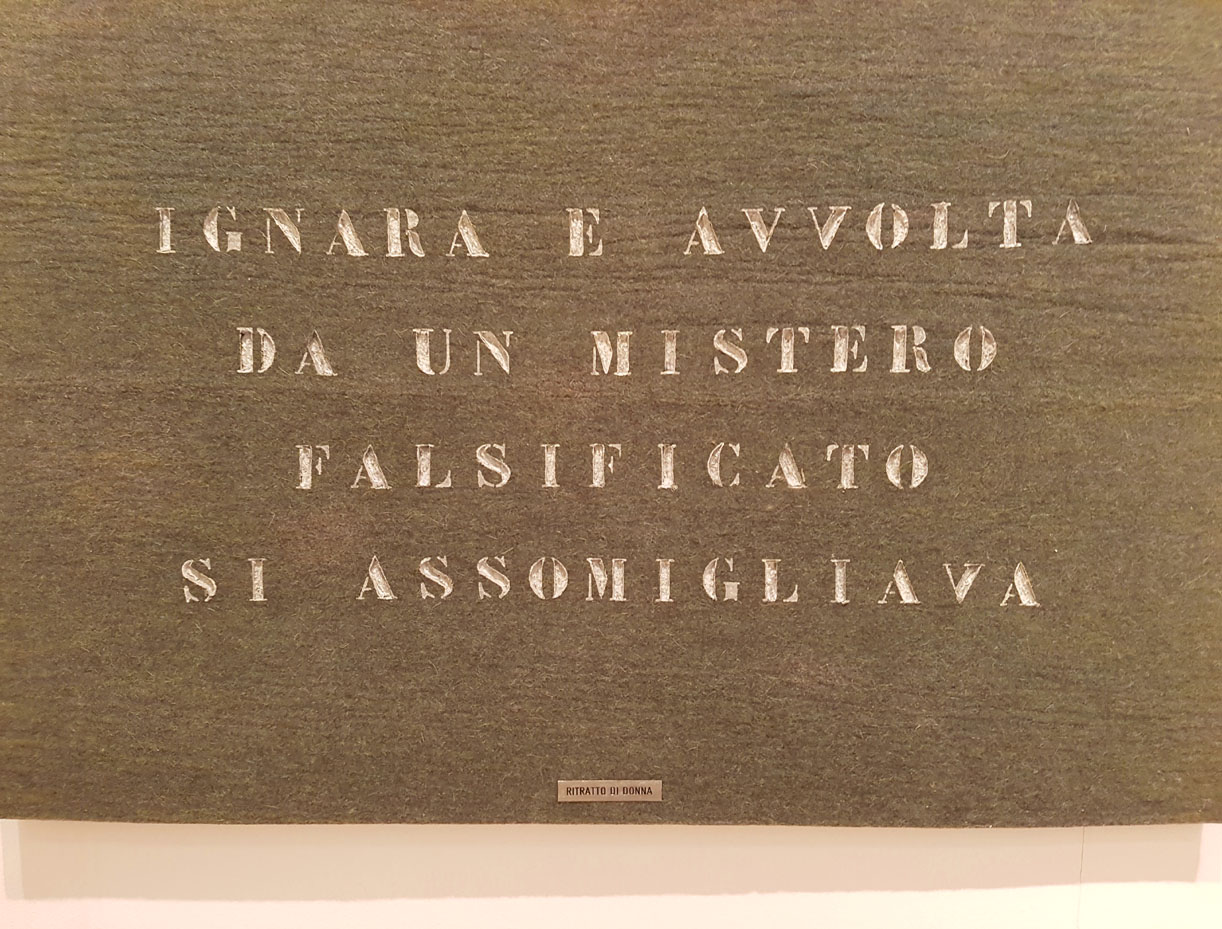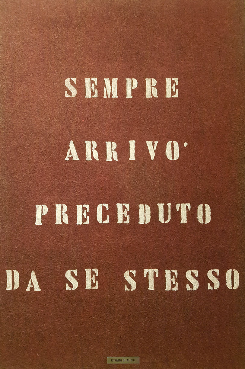 Un lavoro che fa onore alla contraddizione permanente e al paradosso. Sempre con ironia. Agnetti lascia parlare le proprie opere, affidando al pensiero di chi guarda lo sviluppo e il senso di quanto egli ha scritto e immaginato. Una poetica concettuale per cui mezzo e supporto sono fondamentali. Ricerche che incidono Assiomi sulla fredda bachelite nera -supporto di un enunciato concettuale, vedi: L’arte è la deposizione del pensiero e il pensiero è la dilatazione dell’arte-, e si stampano sul ruvido calore del feltro dipinto per fingersi supporto di una narrazione. I Ritratti, quello dell’Amante per esempio recita: Chiuso in se stesso nel corpo di un altro.