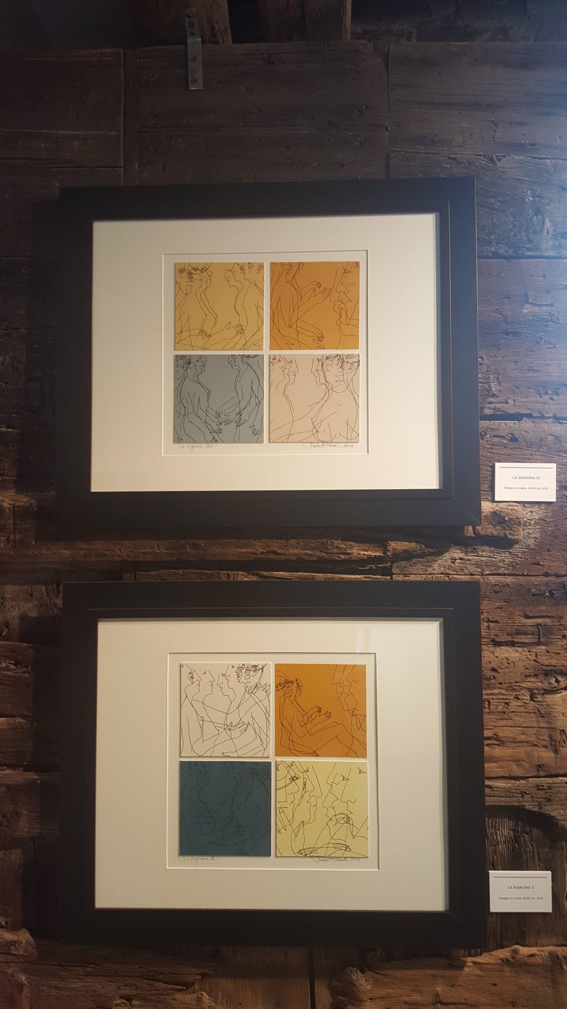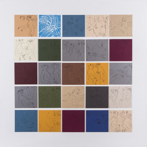 I profili appena accennati di queste figure – che sembrano discendere da un mondo arcaico e misterioso – sono i protagonisti anche della serie Drawings, in cui però l’artista si focalizza sull’intero corpo umano, che acquisisce fisicità e una velata carica erotica. Osservando queste composizioni bidimensionali, in cui i soggetti – tutti rigorosamente identici – galleggiano sospesi in un tempo e in uno spazio indefinito, sembra di assistere a tratti al lento cadenzare di un video in slow motion, dove i corpi nudi di uomini e donne si cercano, si desiderano, si abbracciano e si incontrano nel delicato sfiorarsi di una mano su un volto.