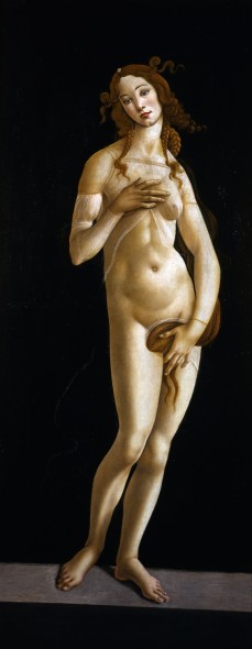 Solo tre Veneri sopravvivono attribuibili a Botticelli o alla sua bottega: la Venere di Berlino, quella di Torino e una già in collezione privata a Ginevra. Le prime due sono state esposte entrambe ai Musei Reali in occasione della prima edizione di Confronti, nel 2016. Si tratta di nudi monumentali, che possono essere annoverati tra i primi dipinti profani dell’Europa postclassica e che trovano ispirazione in un modello antico che conosciamo come Venere de’ Medici, o Venere pudica, dove la Dea è sorpresa a coprirsi con le mani il seno e il pube.