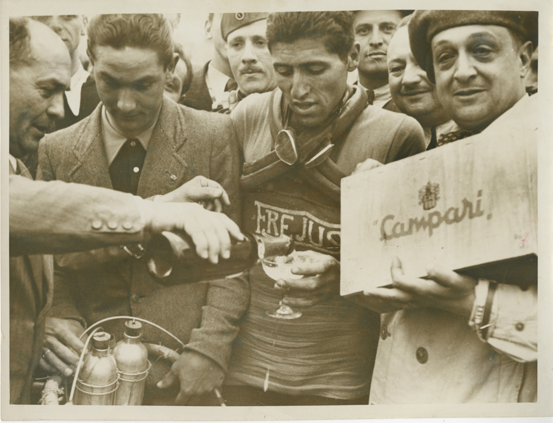 Le immagini ripercorrono l’arco temporale dagli anni Trenta agli anni Sessanta, in cui il marchio Campari ha seguito i ciclisti del calibro di Coppi, Girardengo, Cinelli, Moser, Anquetil, Baldini, Gaul, Magni, nelle ventuno tappe del Giro d’Italia, nelle tappe del Giro dei Tre Mari e in quelle del Gran Premio di Lugano, diventando, da sponsor delle manifestazioni, vero e proprio compagno delle imprese di una delle discipline sportive più onorate al mondo. Alle fotografie d’epoca, disposte su una pista che simula il circuito di gara, si affiancano le grafiche pubblicitarie originali, firmate da Franz Marangolo*(1912-1995) e da altri autori degli anni Cinquanta e Sessanta, che propongono una storia fatta di brillanti intuizioni e di strategie comunicative d’avanguardia.