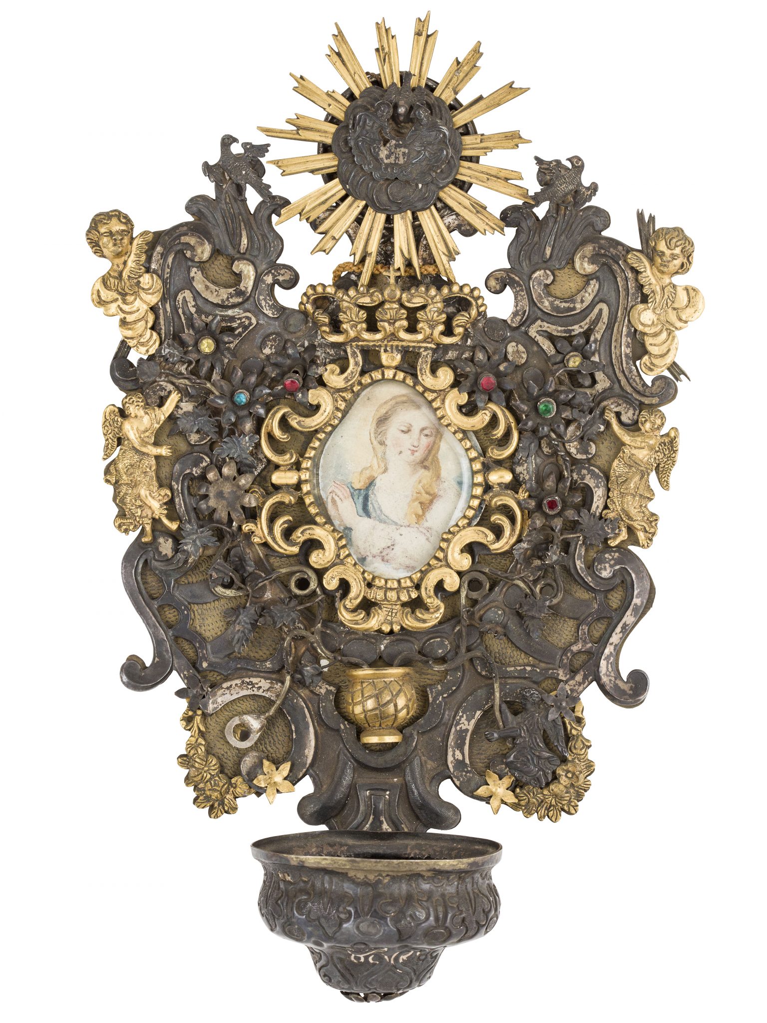 Un’acquasantiera in argento, rame dorato e pietre policrome, arricchita da una bella miniatura, della prima metà del Settecento e caratterizzata dalla ricchezza di ornati e dalla policromia barocca così caratteristica dei lavori delle maestranze meridionali è valutata 1.000 – 1.500 euro, un imponente crocefisso in avorio (76 centimetri di lunghezza) su di una croce in legno e rame dorato, del XVIII secolo, perfetto esempio della miglior committenza devozionale del tempo è stimato 5.000 – 7.000 euro.