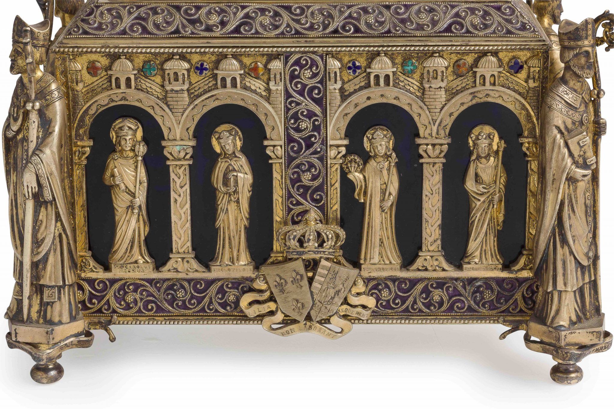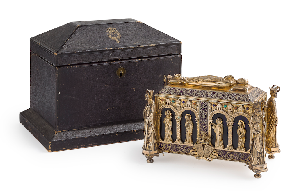 Di gusto neogotico e decorato a figure recante l’arma matrimoniale del conte di Chambord e di Maria-Teresa d’Asburgo-Este in cofanetto originale