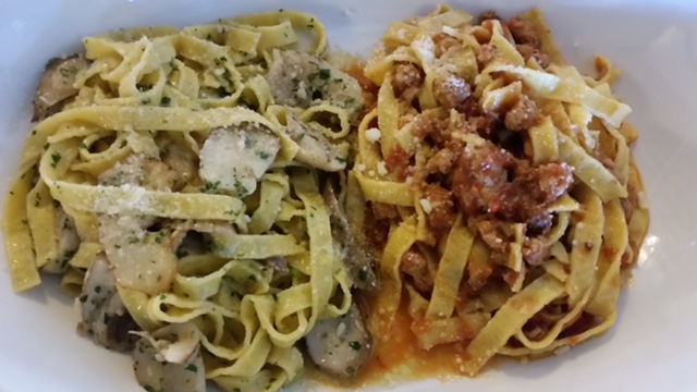 Lo abbiamo nominato così tante volte, il Re dei salumi, che bisogna per forza farsene portare un assaggio, ché a ignorarlo quasi si passa da screanzati. E in effetti le aspettative non vengono tradite: Sua Maestà è piuttosto stagionato, magro ma ancora molto morbido, col suo odorino penetrante di muffa buona e di cantina, ed un sapore che a un certo punto vira quasi sul piccante. La navigazione attraverso il microcosmo “Osteria Ardenga” continua con le tagliatelle ai funghi porcini, e poi anche al ragù di salame, e saltando per arrivare al dolce ecco la torta millegusti. Tre strati di consistenze diverse, una specialità della Bassa buona e sorprendente: la maître nonché moglie dello chef, Daniela Cassi, mi ha garantito che la preparano ancora da queste parti, di Domenica, quelle mamme e quelle suocere che per amore o per forza ti invitano a pranzo.