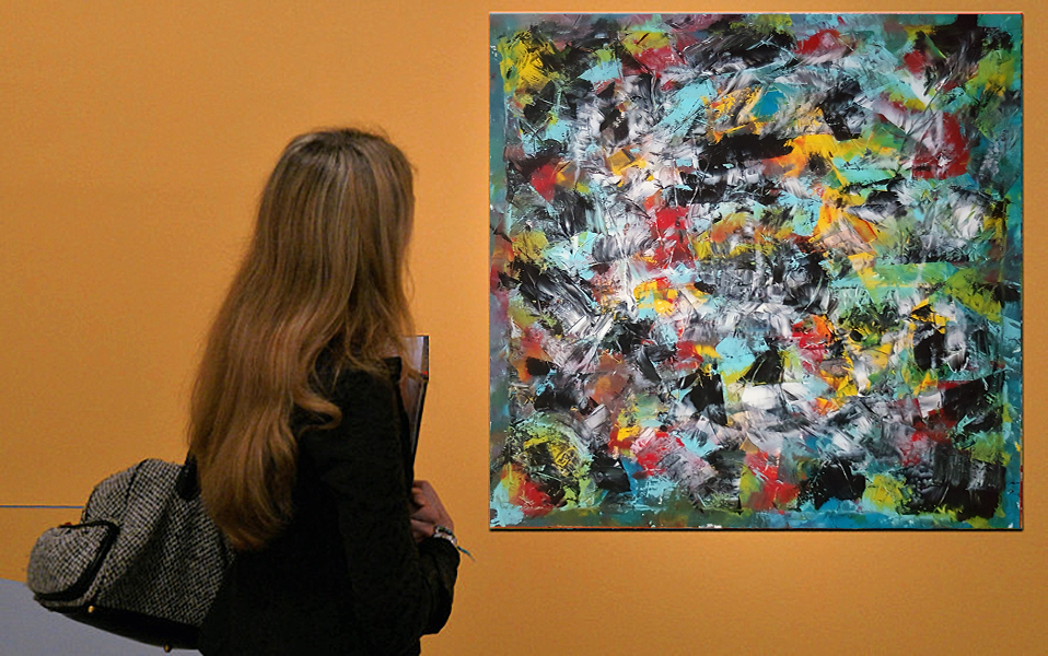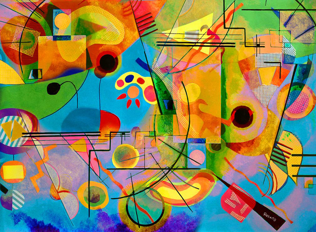 Rizzato però non si è limitato ad “inventare” solo questa tecnica. Accanto alla produzione digitale, da qualche tempo crea anche DIPINTI A MANO non figurativi ed esclusivamente acrilici, a proposito dei quali ci ha raccontato: «Neanch’io so bene cosa vogliano dire (quando a Pollock domandavano il significato di ciò che creava facendo sgocciolare il suo pennello, lui rispondeva: “Scusi, ma lei di fronte a un bel prato fiorito si chiede che significato abbia? Lo ammira e basta!”). Ma il bello dell’astrattismo è che ciascuno ci può vedere ciò che sente dentro di sé. Sono un artista spontaneo, dipingo per astrazione gestuale, pennellando delle macchie di colore secondo la mia ispirazione inconscia. La mia pittura non rappresenta niente di oggettivo; però stimola profondamente e prepotentemente l’immaginazione e l’emotività di chi guarda. Spesso dipingo nella penombra e sul pavimento, perché poi -quando il quadro verrà appeso in alto sulla parete- possa portare luce e gioia nei momenti più oscuri, grazie alla potenza taumaturgica dei colori. Non amo particolarmente la pittura materica; quindi non aggiungo altro materiale alla vernice. Però depongo strati molto spessi di colore, perché voglio che i miei quadri possano trasmettere anche una sensazione tattile. Sono da vedere, ma anche da toccare! Perché i quadri vanno accarezzati come le persone che amiamo».
