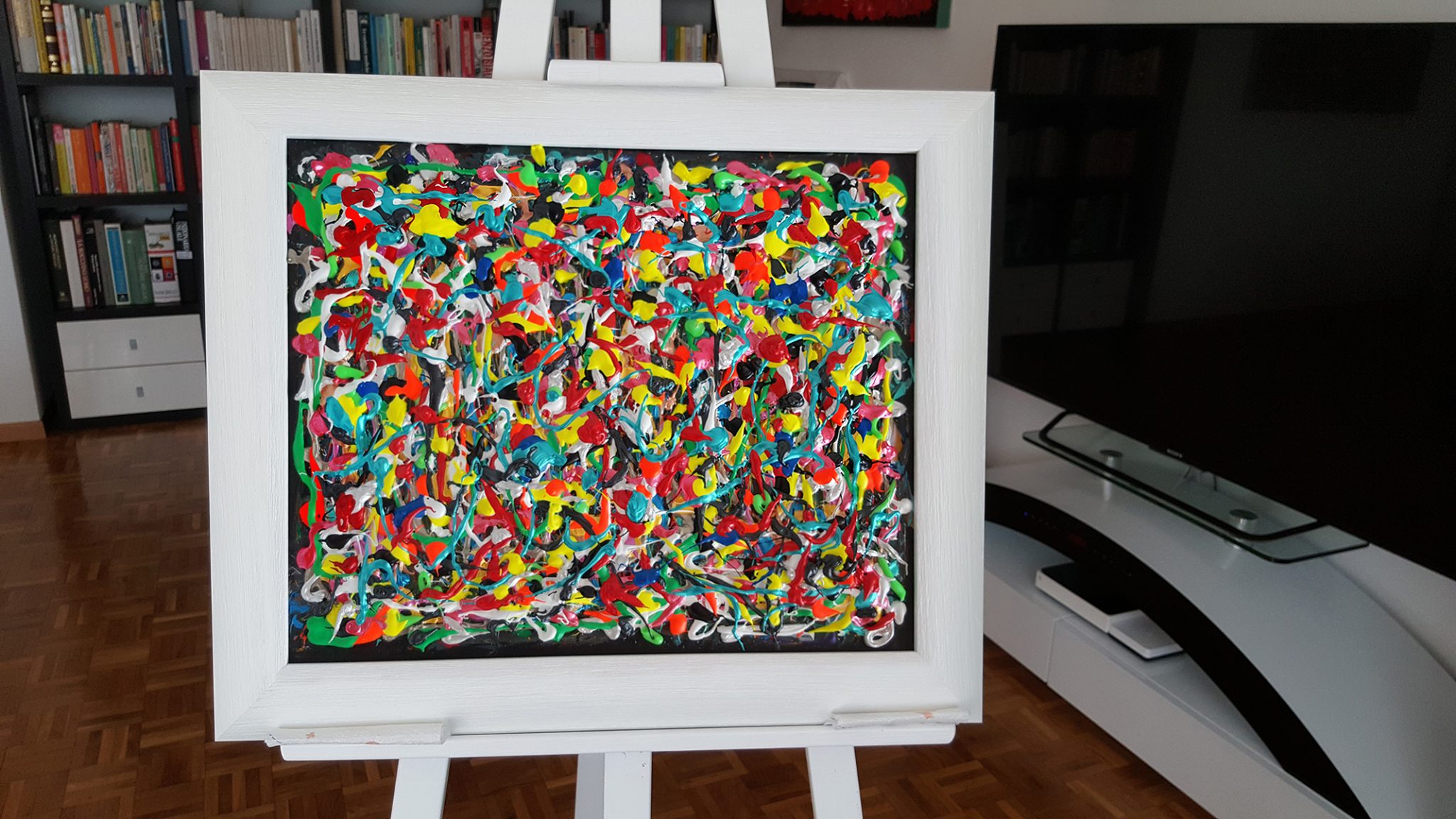 A proposito di questi suoi ultimi lavori, gli abbiamo chiesto di spiegarci più nel dettaglio la tecnica utilizzata: «Non è un “dripping” ma uno “squeezing”, perché lo faccio proprio spremendo i tubetti della vernice (acrilica) e usando il quadro, già incorniciato, come una sorta di catino. È una riqualificazione artistica, perché si stratifica la vernice sopra qualcosa di preesistente (un quadro di poco valore comprato al mercatino dell’usato), sovradipingendolo. Nella fattispecie, questa tecnica si configura come una sorta di regressione subliminale ai gesti e ai colori della nostra infanzia, perché ne risulta un dipinto tattile e anche un po’ gustativo. Il prototipo di quella che potrei denominare PITTURA ORGANOLETTICA, in quanto stimola un po’ tutti i sensi; ma soprattutto la FANTASIA. Come diceva Picasso: “Da bambini siamo tutti artisti; il difficile è continuare a esserlo anche da grandi”».