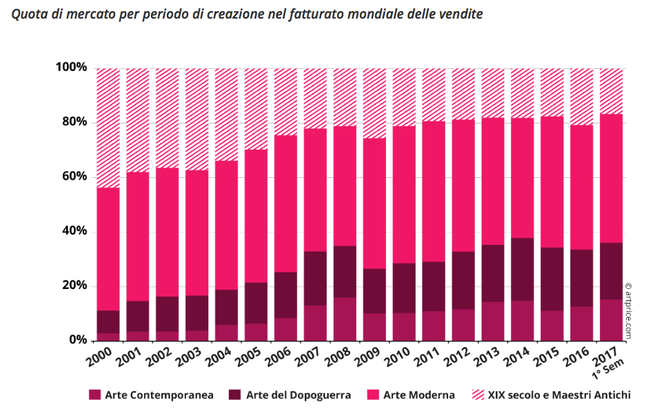 Secondo i redattori di Artprice nel 2015, l’arte moderna ha superato quella contemporanea grazie alle vendite stellari di tre capolavori diPicasso (179 milioni di dollari), Giacometti (170 milioni di dollari) e Modigliani (141 milioni di dollari) che sono «sembrati piuttosto un canto del cigno: l’urgenza di acquistare le ultime meraviglie di un mercato praticamente esaurito, di mettere le mani su opere destinate a raggiungere presto o tardi un grande museo. In questo periodo, le esitazioni dei collezionisti nei confronti dell’Arte Contemporanea si sono ripercosse sulle prestazioni di questo settore: il fatturato 2015/2016 ha registrato un calo del 27%.»