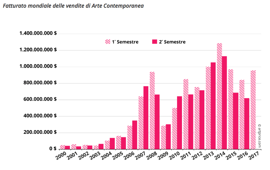 Le vendite di Arte Contemporanea ritrovano un andamento crescente. Per due anni consecutivi, il fatturato è calato sensibilmente, fino al secondo semestre del 2016, in cui ha perso il 10%. Il ritorno alla crescita si è fatto sentire attraverso le prestazioni del primo semestre 2017: un aumento del fatturato mondiale del 14% inaugura un nuovo periodo di prosperità.