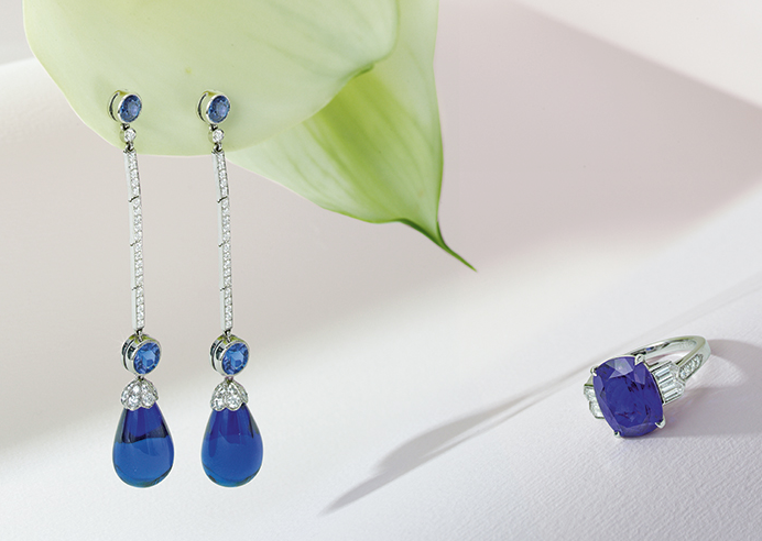 Pair of Tanzanite and Diamond Earrings, Tiffany & Co. Each earring set with two round tanzanites and a line of round diamonds, supporting two tanzanite drops capped by round diamonds, signed T & Co Estimate  18,000 — 22,000  USD Tanzanite and Diamond Ring, Tiffany & Co. Set with a cushion-cut tanzanite weighing 6.65 carats, accented by bullet-shaped and round diamonds, size 6, signed Tiffany & Co., numbered 23981424. With signed box. Estimate  5,000 — 7,000  USD