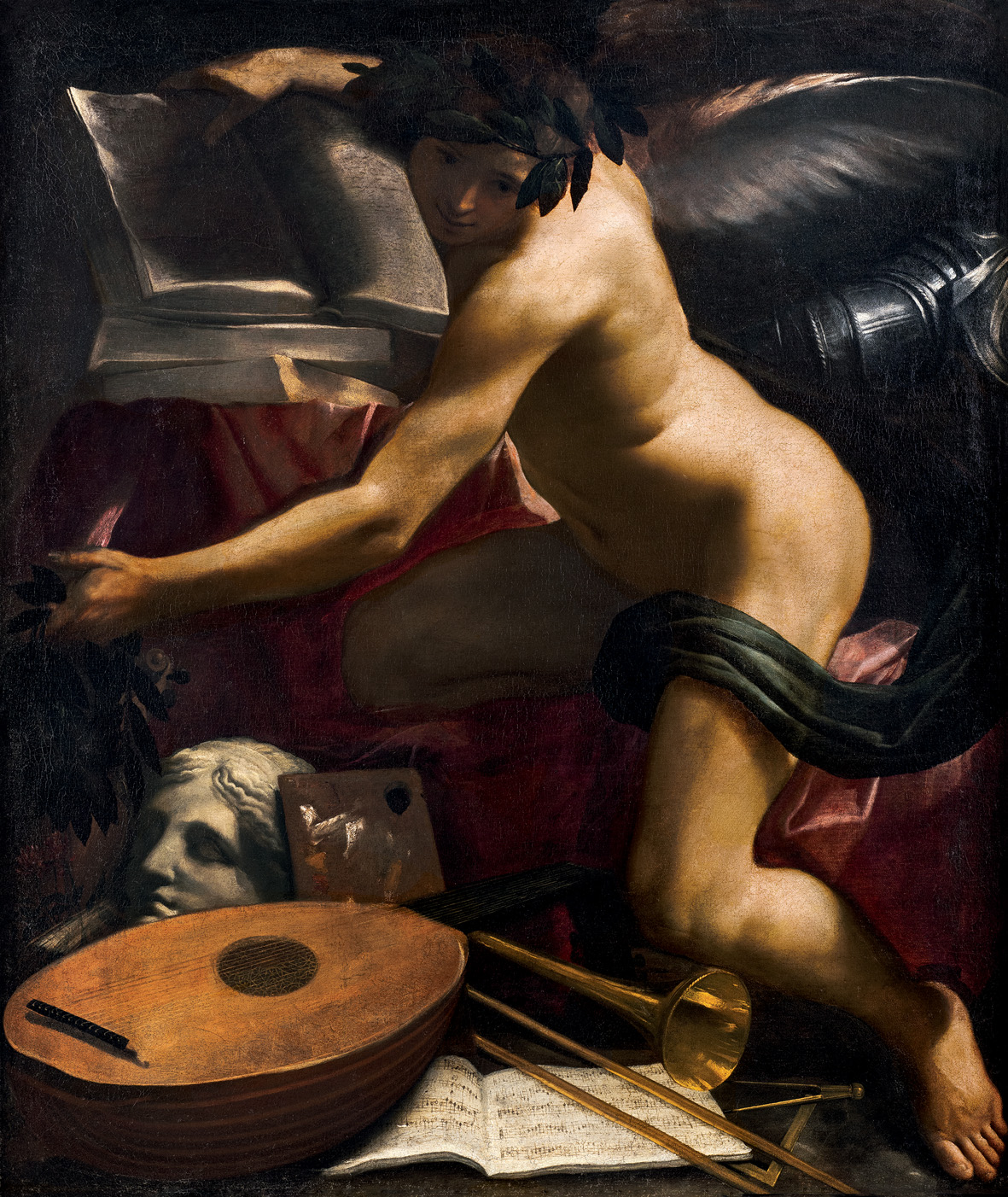 Carlo Bononi fu anche interprete di una classe di committenti colti e attenti alle arti, con preferenze spiccatamente musicali, inclini a contenuti figurativi un po’ licenziosi, come provano le varie redazioni del Genio delle arti, capolavori con i quali Bononi dialoga apertamente con Caravaggio e con i suoi seguaci.