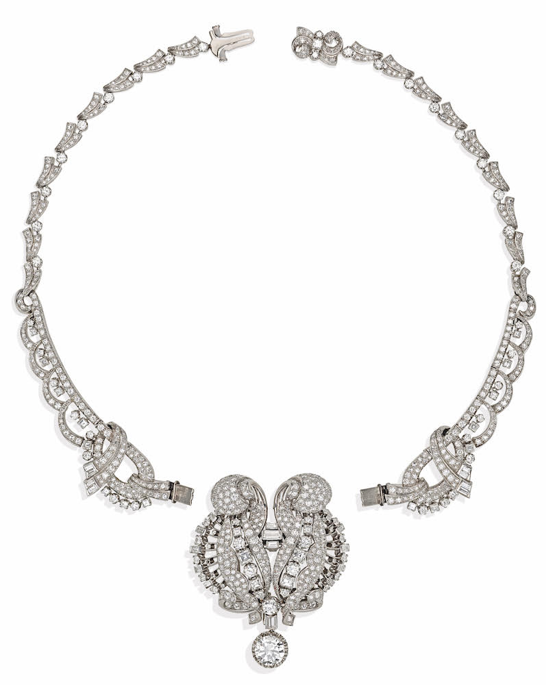 Un collier Chopard con una diamante a goccia di 22ct, amovibile, e diamanti taglio brillante per un totale di circa 60ct; un bracciale, sempre Art Decò firmato Oscar Heyman, datato 1925, e battuto da Christie’s negli 90 per un valore di 400,000 dollari. Tra i lotti più significativi compaiono anche un paio di orecchini in oro bianco, con diamante taglio brillante da 15ct e due perle naturali di 13mm, un raffinatissimo bracciale Cartier London con un torchon di perle e fermezza in platino e diamanti.
